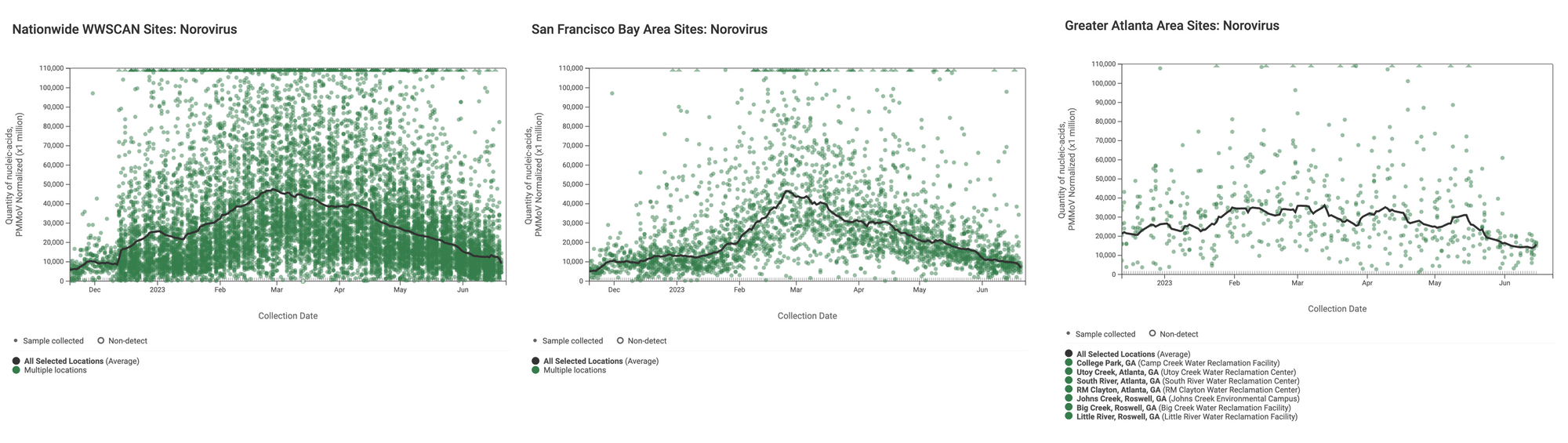Norovirus GII (HuNoV GII) RNA has been consistently detected at the sites. The median concentration across all sites over the last 21 days is 5,451,592 copies/gram. Example charts showing concentrations (normalized by PMMoV) in wastewater solids below are from all participating sites across the country (left panel), San Francisco Bay Area sites (middle panel), and Atlanta Metro Area sites (right panel). The weighted average lines in these plots appear to be trending down.