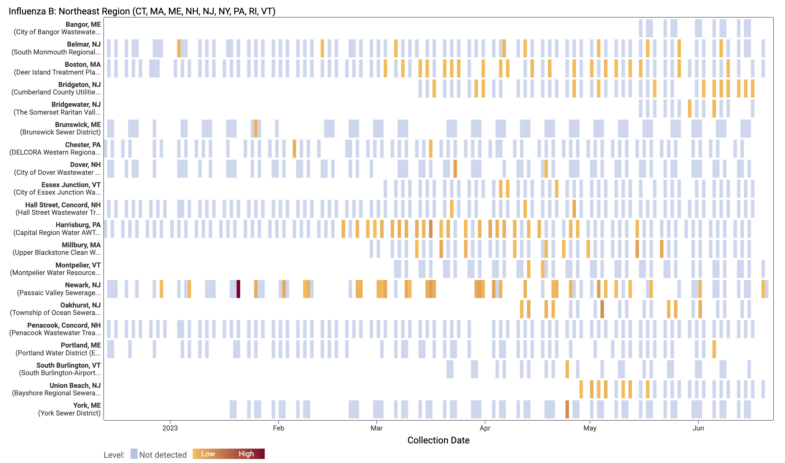 Influenza B (IBV) RNA concentrations are mostly non-detect at WWSCAN sites. There have only been 178 positive samples out of 1,316 samples during the past 21 days (~14% detection rate), all at low concentrations. Below is a heat map showing IBV detections at all the plants in WWSCAN in the Northeast USA. Each location is a row, and the date is a column. White indicates no sample, blue indicates non-detect, and the orange to red show variable concentrations if IBV. You can see how IBV RNA is occasionally detected since we began measuring it in mid December 2022 at these sites.