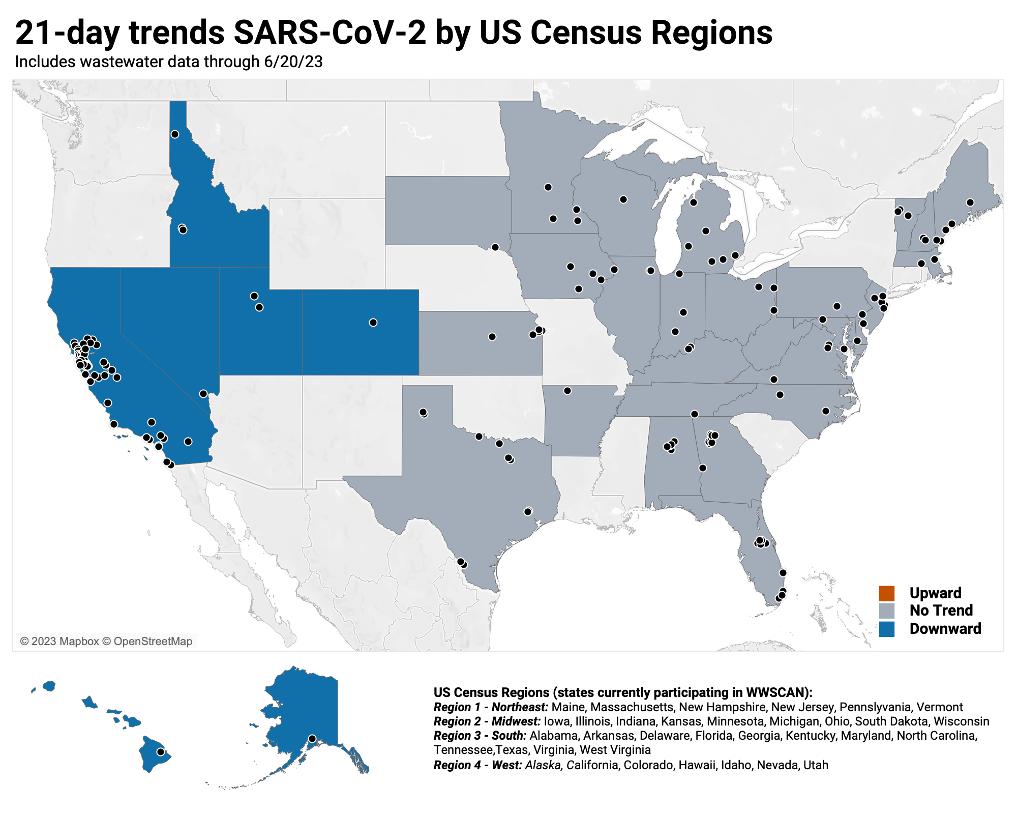 When we look at the 21-day trends at the US Census Region level, no regions show an upward trend, the Midwest, Northeast and South regions show no trend, and the West show decreasing trends.