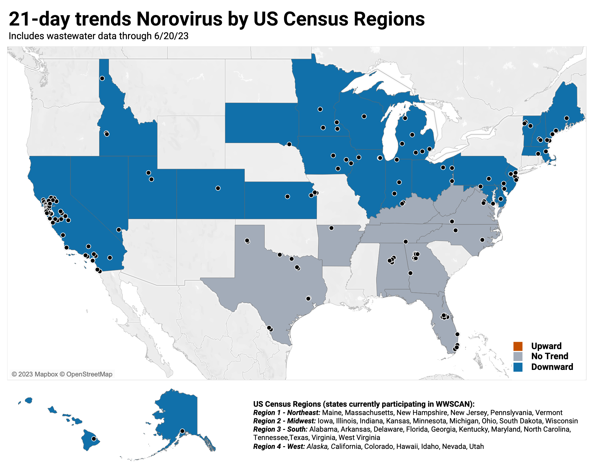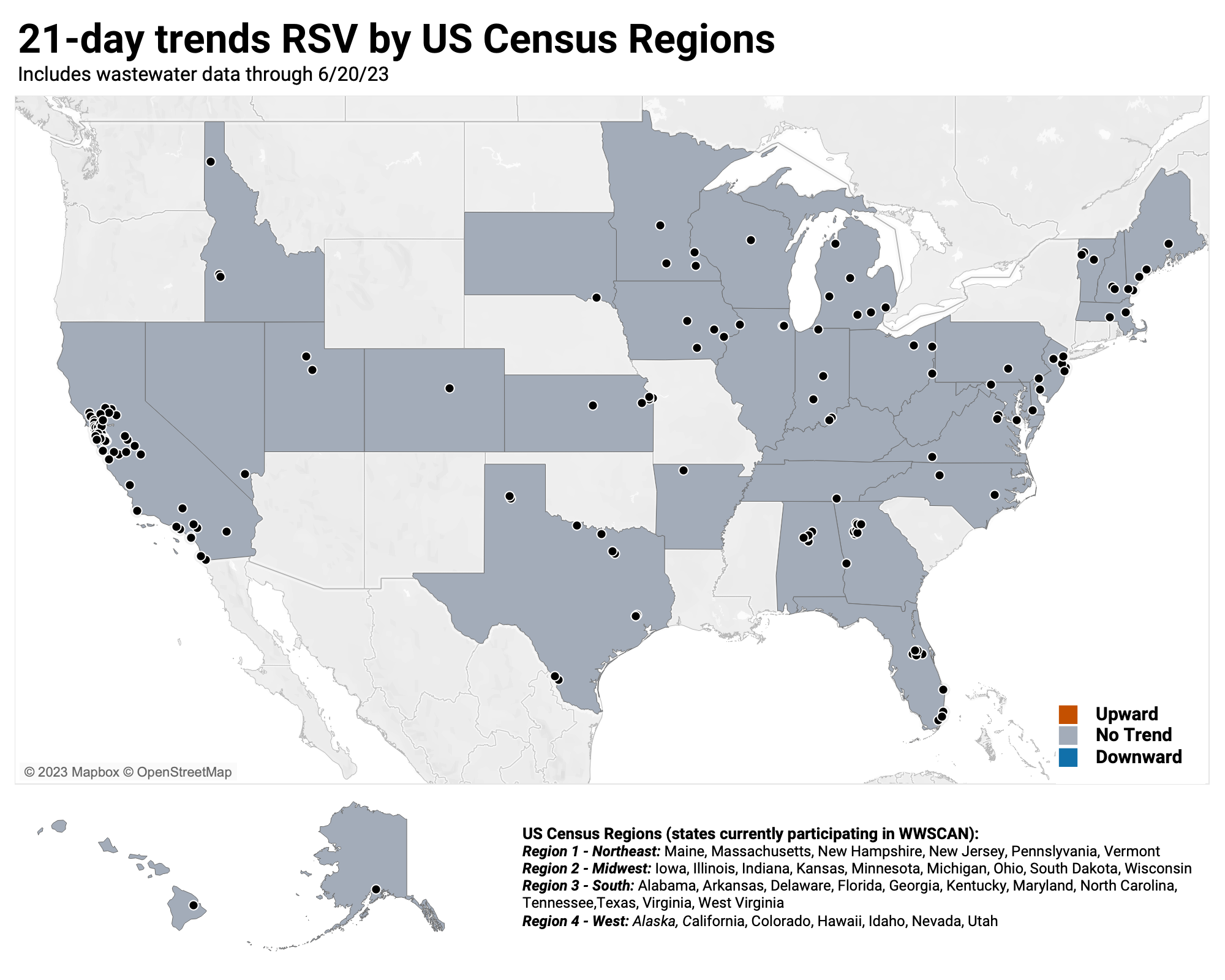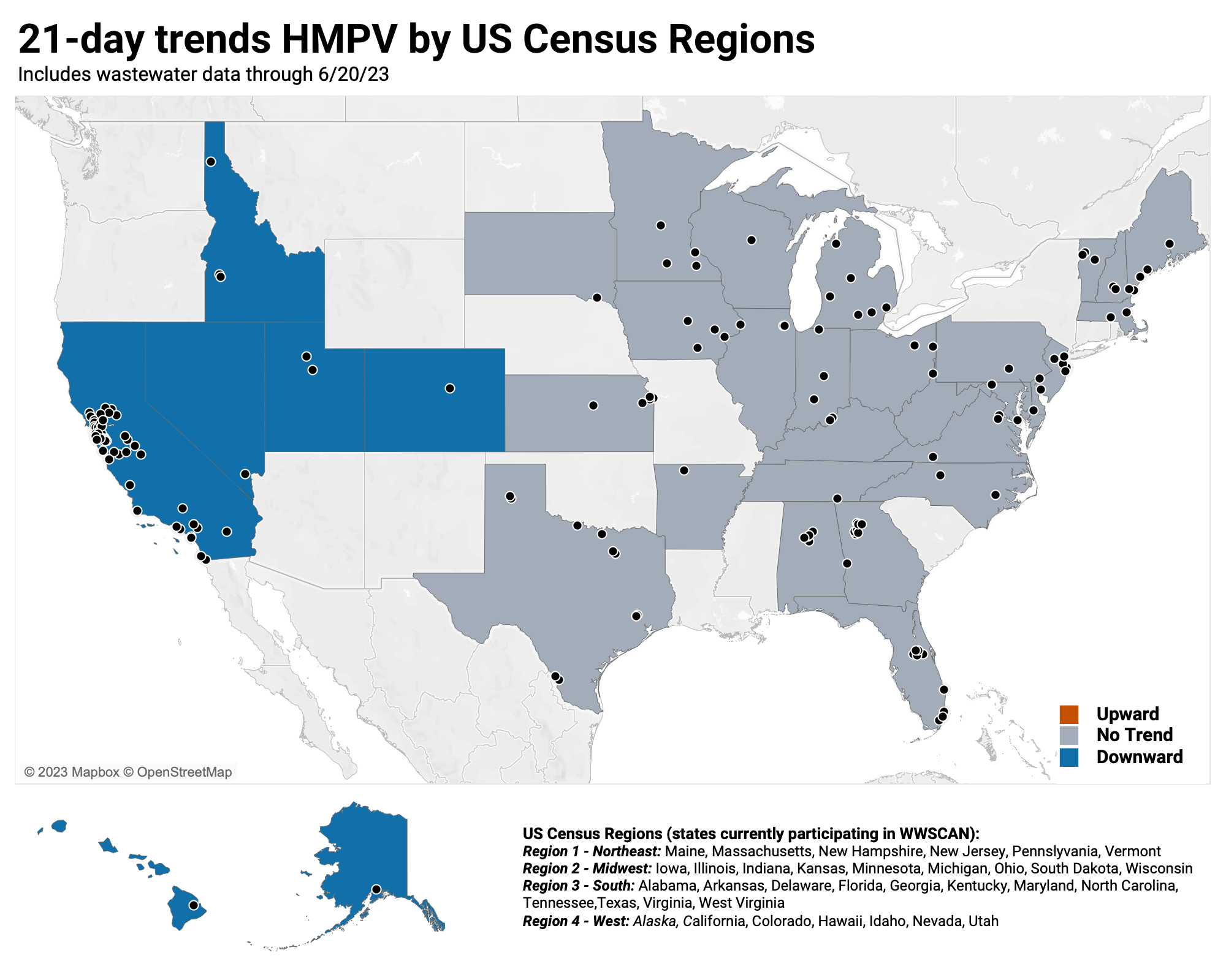 When we look at the 21-day trends at the US Census Region level, the Midwest, Northeast and South show no trend, and the West shows show decreasing trends.