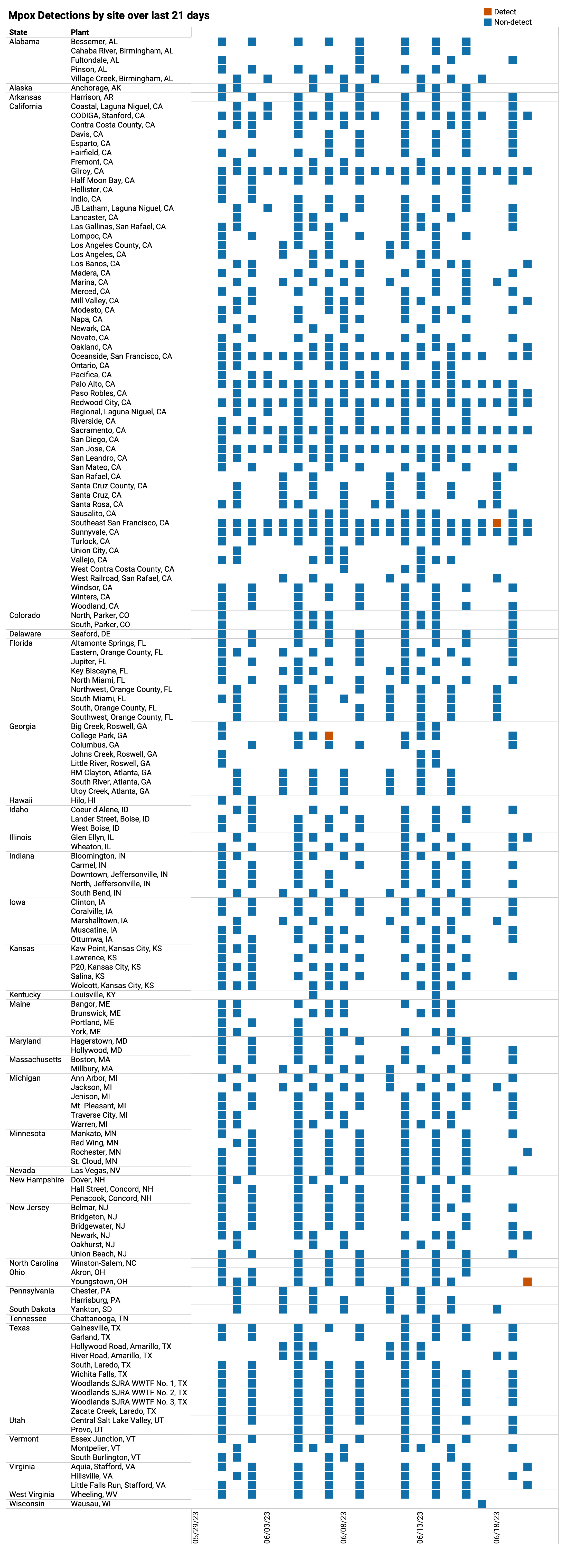 Mpox DNA We rarely detected mpox DNA in samples from any site over the past three-weeks. Below you can see, in red, there have only been 3 positive samples out of 1,316 samples during the past 21 days. Outbreaks seem to be under control, but we will continue to monitor so that public health departments can respond if we see consistent detections and increases in concentrations in any sites. The chart below shows every plant in WWSCAN (approximately 162) as rows, and the last 21 days as columns (labeled at the bottom axis). White indicates no samples, blue is non-detect for mpox DNA and red is detect for mpox DNA. As a reminder, you can access our paper in New England Journal of Medicine about how mpox wastewater monitoring compares to clinical reports of infectious here.