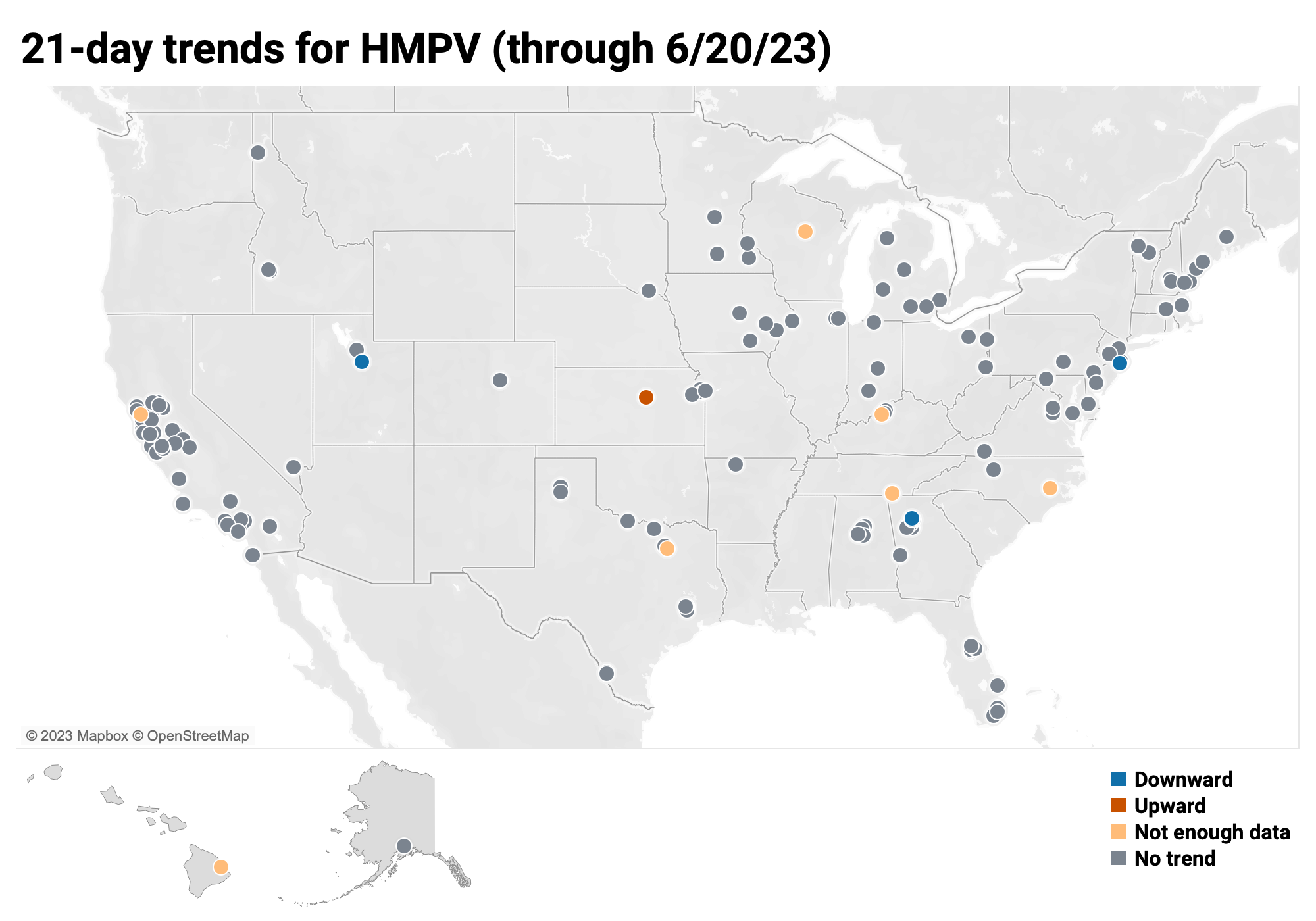 Below is the trend analysis for the RSV RNA concentrations (normalized by PMMoV) in wastewater solids at all participating plants. Red indicates a significant upward trend, blue is a significant downward trend, and dark grey is no trend. Yellow indicates that there were not enough data points to calculate a trend. Of the 162 sites, 1 shows an upward trend, 151 show no trend, and 3 show a decreasing trend. The remaining 7 sites (Chattanooga TN, Hilo HI, Kinston NC, Louisville KY, Petaluma CA, Sunnyvale TX, and Wausau WI) do not have enough data to calculate a trend.