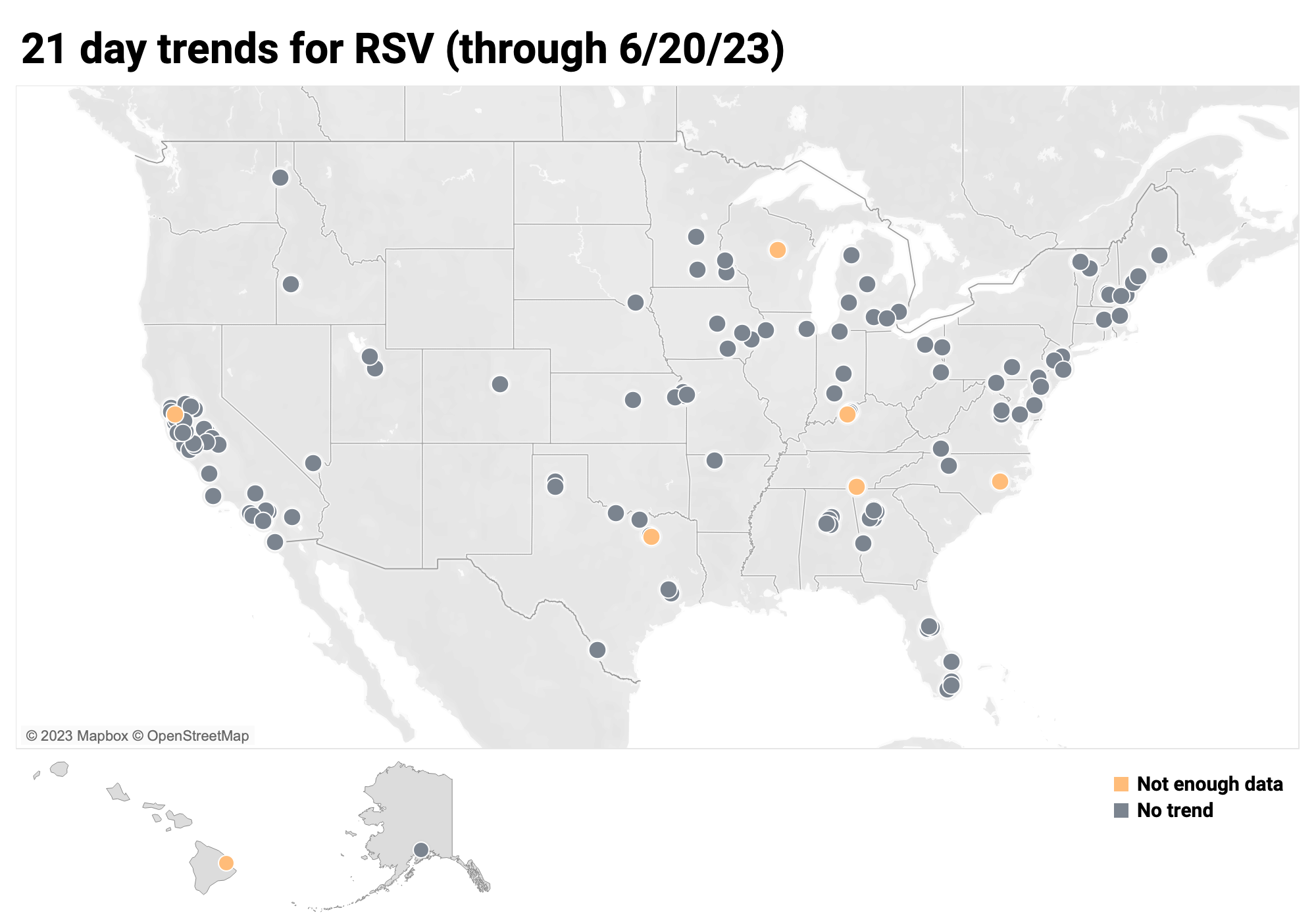 Below is the trend analysis for the RSV RNA concentrations (normalized by PMMoV) in wastewater solids at all participating plants. Red indicates a significant upward trend, blue is a significant downward trend, and dark grey is no trend. Yellow indicates that there were not enough data points to calculate a trend. Of the 162 sites, 0 shows an upward trend, 155 show no trend, and 0 show a decreasing trend. The remaining 7 sites (Chattanooga TN, Hilo HI, Kinston NC, Louisville KY, Petaluma CA, Sunnyvale TX, and Wausau WI) do not have enough data to calculate a trend.