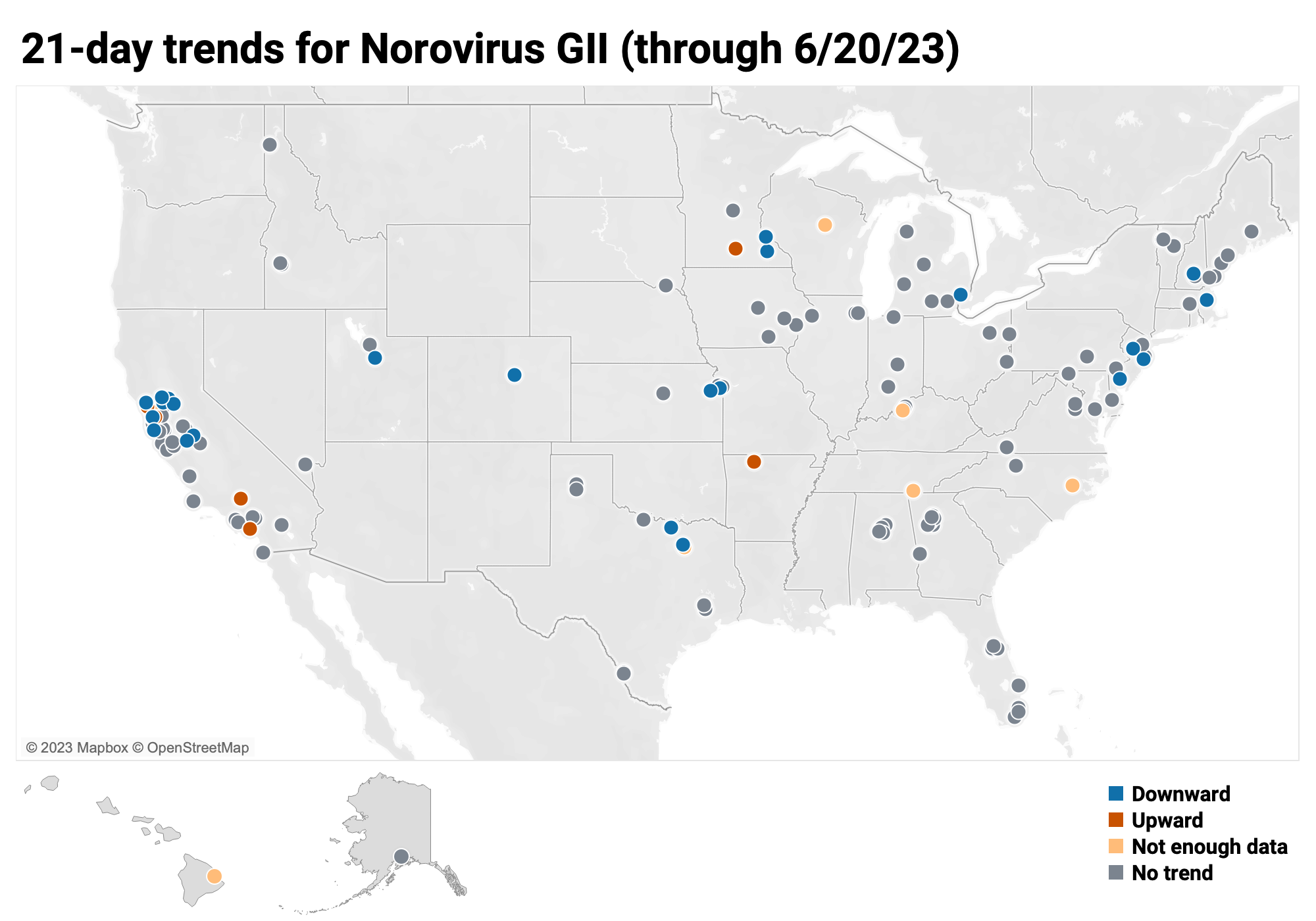 Below is the trend analysis for the Norovirus GII RNA concentrations (normalized by PMMoV) in wastewater solids at the plants. Red indicates a significant upward trend, blue is a significant downward trend, and dark grey is no trend. Yellow indicates that there were not enough data points to calculate a trend. Of the 162 sites, 7 show an upward trend, 124 show no trend, and 24 show a decreasing trend. The remaining 7 sites (Chattanooga TN, Hilo HI, Kinston NC, Louisville KY, Petaluma CA, Sunnyvale TX, and Wausau WI) do not have enough data to calculate a trend.