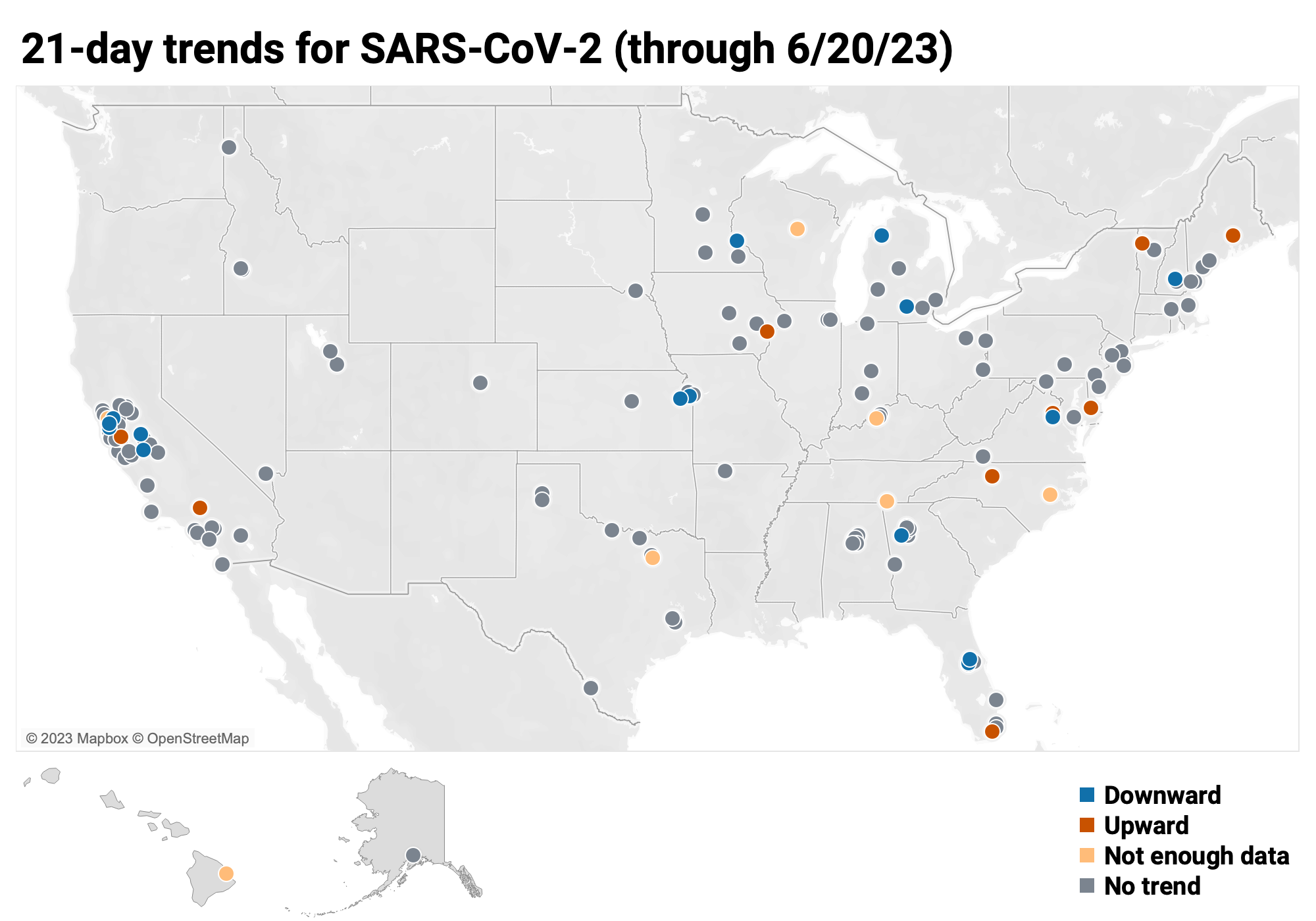 Below is the trend analysis for the SARS-CoV-2 RNA concentrations (N gene concentrations normalized by PMMoV) in wastewater solids at all participating plants. Red indicates a significant upward trend, blue is a significant downward trend, and dark grey is no trend. Yellow indicates that there were not enough data points to calculate a trend (we required 3 points over the last 21 days). You can read about our methods for trend analysis here. In short, we test for linear trends between log10-transformed concentration (target/PMMoV) and time; the trend must be classified as statistically significant (p<0.1). Of the 162 sites, 9 show an upward trend, 131 show no trend, and 15 show a decreasing trend. The remaining 7 sites (Chattanooga TN, Hilo HI, Kinston NC, Louisville KY, Petaluma CA, Sunnyvale TX, and Wausau WI) do not have enough data to calculate a trend.