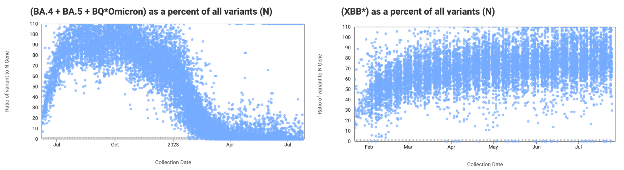The ratio of the XBB* mutations/N across all WWSCAN plants is shown in the chart below on the right. As the ratio reaches 100%, it suggests that all the SARS-CoV-2 genomes in wastewater have the XBB* mutations. These data indicate that the average ratio XBB* mutations/N is ~75% but some places show levels as high as 80-100%. This suggests the majority of infections across the communities are caused by XBB*. The chart on the left shows the ratio of the BA.5, BA.4, and BQ* mutation/N across all WWSCAN plants. It can be read the same way as the XBB* chart. The average ratio is about <10%. Note that our XBB* assay will also detect XBB.1.16, XBB.1.9, and FD.2 (XBB.1.5.15.2*).