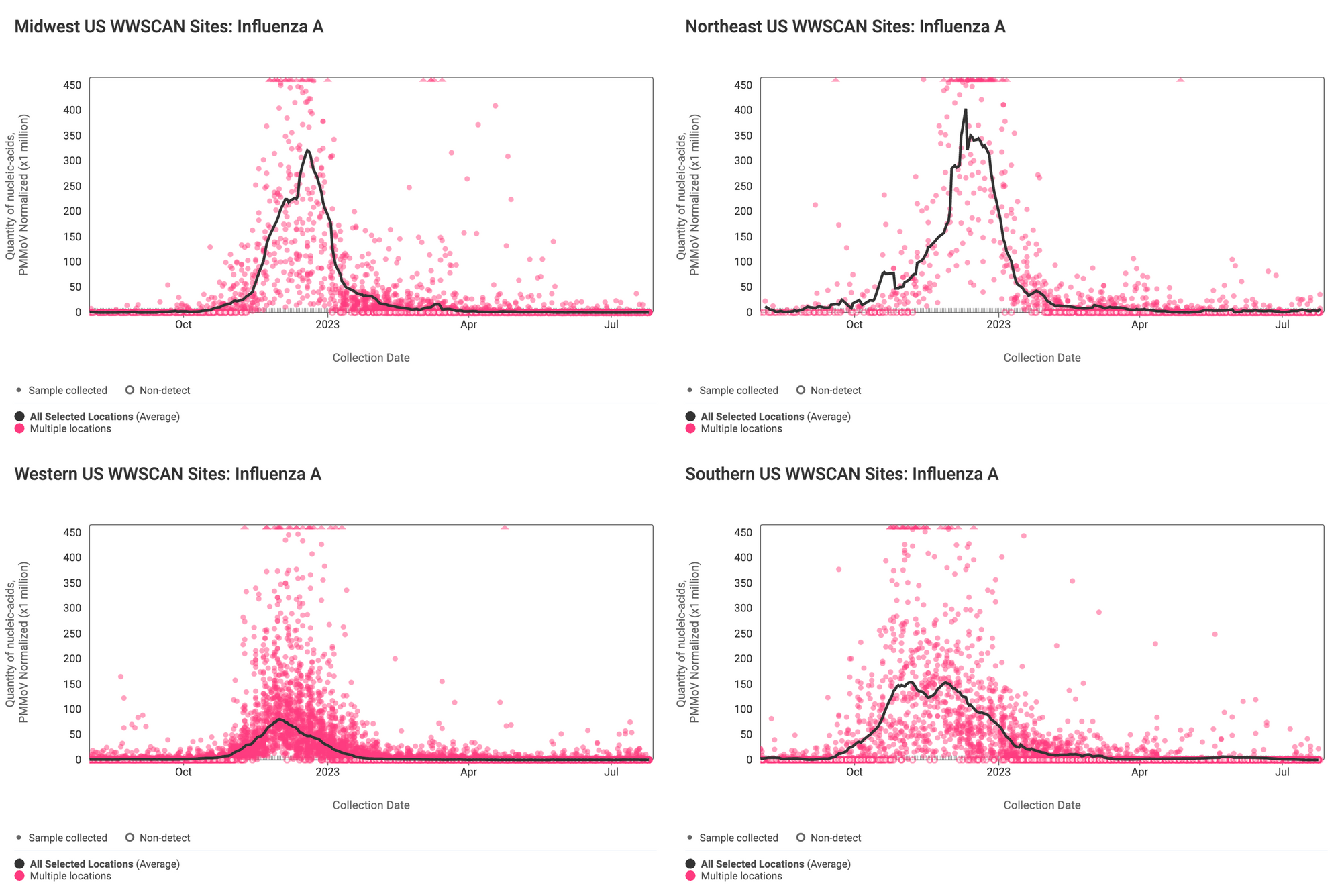 Below are the IAV RNA concentrations (normalized by PMMoV) from sites in the Midwest US (top left panel), Northeast US (top right panel), Southern US (bottom right panel) and Western US (bottom left panel). The population weighted average across regional WWSCAN plants is shown in black. Evident in the data are relatively high concentrations across all US regions around the start of the year with very low levels and mostly non-detects presently observed.