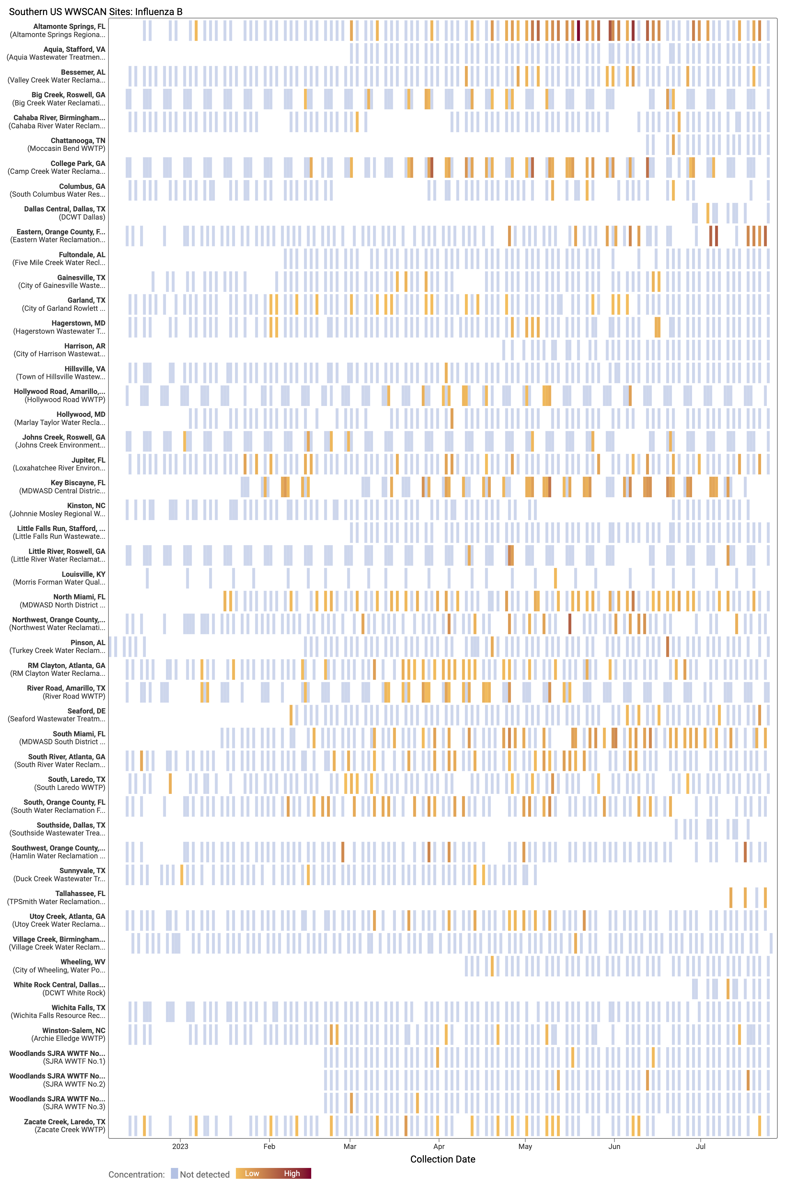 Influenza B (IBV) RNA concentrations are mostly non-detect at WWSCAN sites. There have only been 130 positive samples out of 1,465 samples during the past 21 days (~8% detection rate), all at low concentrations. Below is a heat map showing IBV detections at all the plants in WWSCAN in the Southern USA. Each location is a row, and the date is a column. White indicates no sample, blue indicates non-detect, and the orange to red show variable concentrations if IBV. You can see how IBV RNA is occasionally detected since we began measuring it in mid December 2022 at these sites.