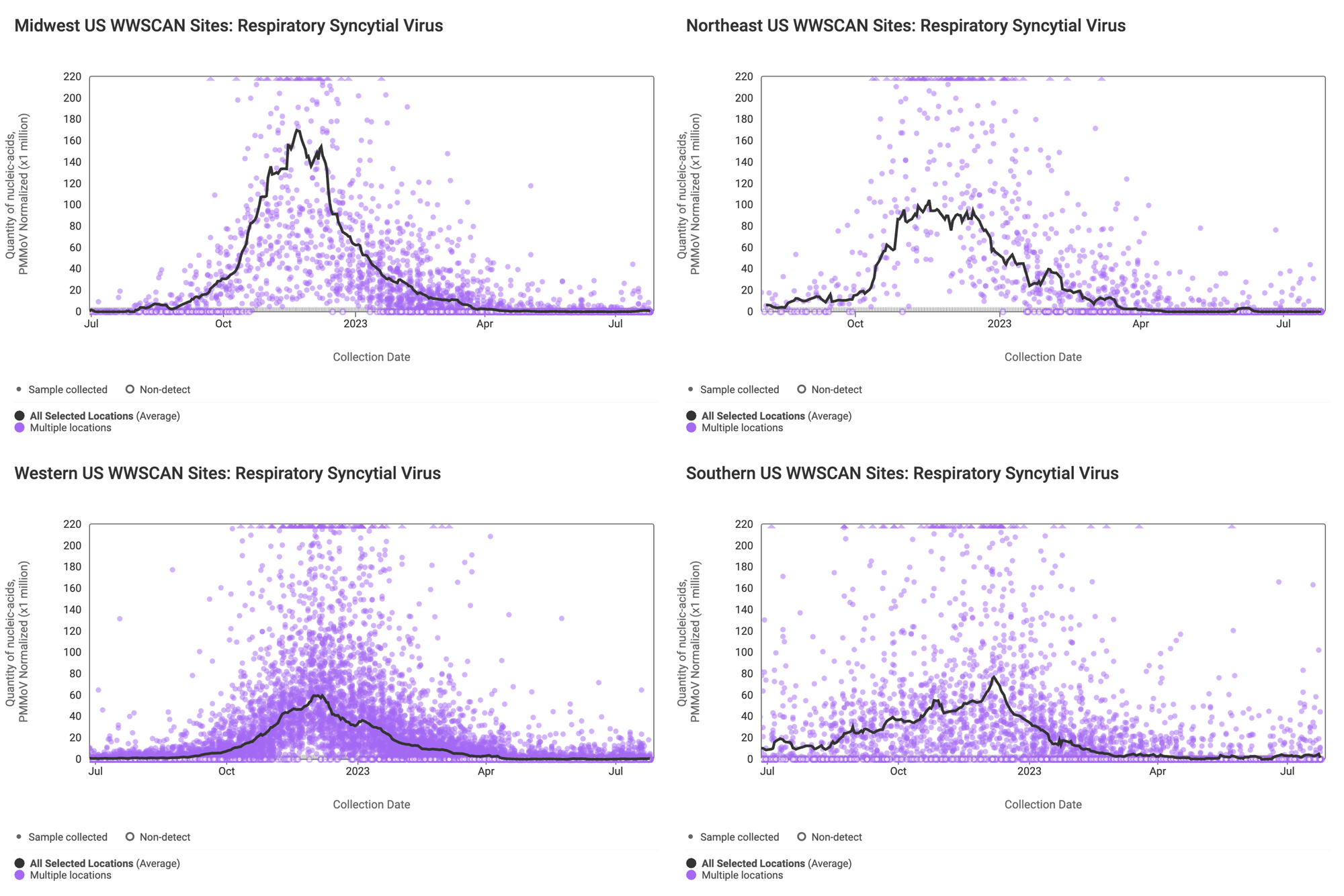 Below are the RSV RNA concentrations (normalized by PMMoV) from sites in the Midwest US (top left panel), Northeast US (top right panel), Southern US (bottom right panel) and Western US (bottom left panel). The population weighted average across regional WWSCAN plants is shown in black. Evident in the data are relatively high concentrations across all US regions around the start of the year with very low levels and mostly non-detects presently observed.