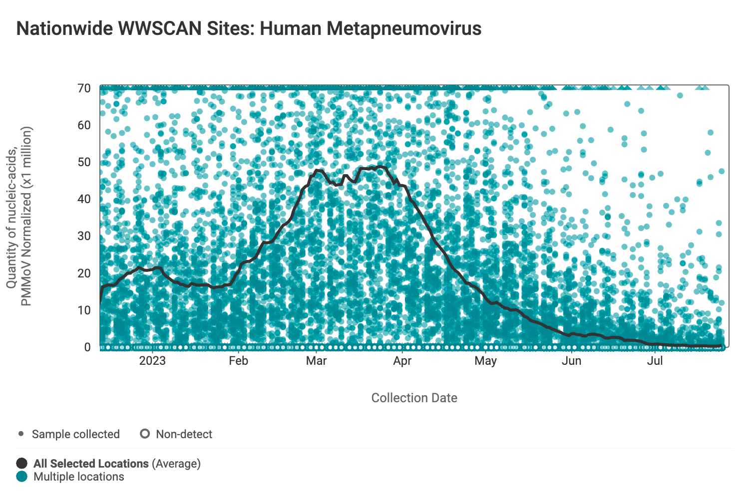 HMPV (human metapneumovirus) RNA concentrations are low signaling the end of HMPV season. The median concentration across all sites over the last 21 days is below the lower detection limit of the assay. Below are the HMPV RNA concentrations (normalized by PMMoV) from all participating WWSCAN sites across the country.