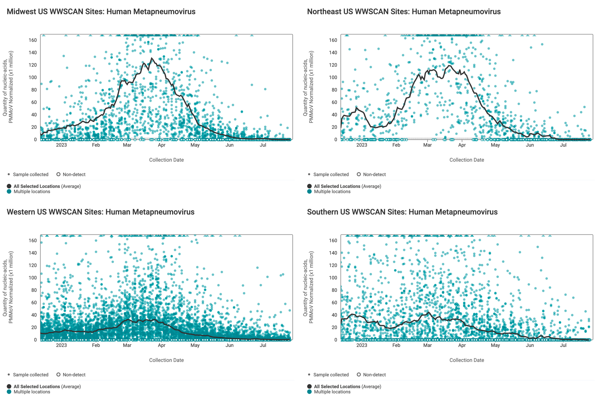 Below are the HMPV RNA concentrations (normalized by PMMoV) from sites in the Midwest US (top left panel), Northeast US (top right panel), Southern US (bottom right panel) and Western US (bottom left panel). The population weighted average across regional WWSCAN plants is shown in black. Evident in the data are relatively high concentrations across all US regions around the start of the year with very low levels and mostly non-detects presently observed.
