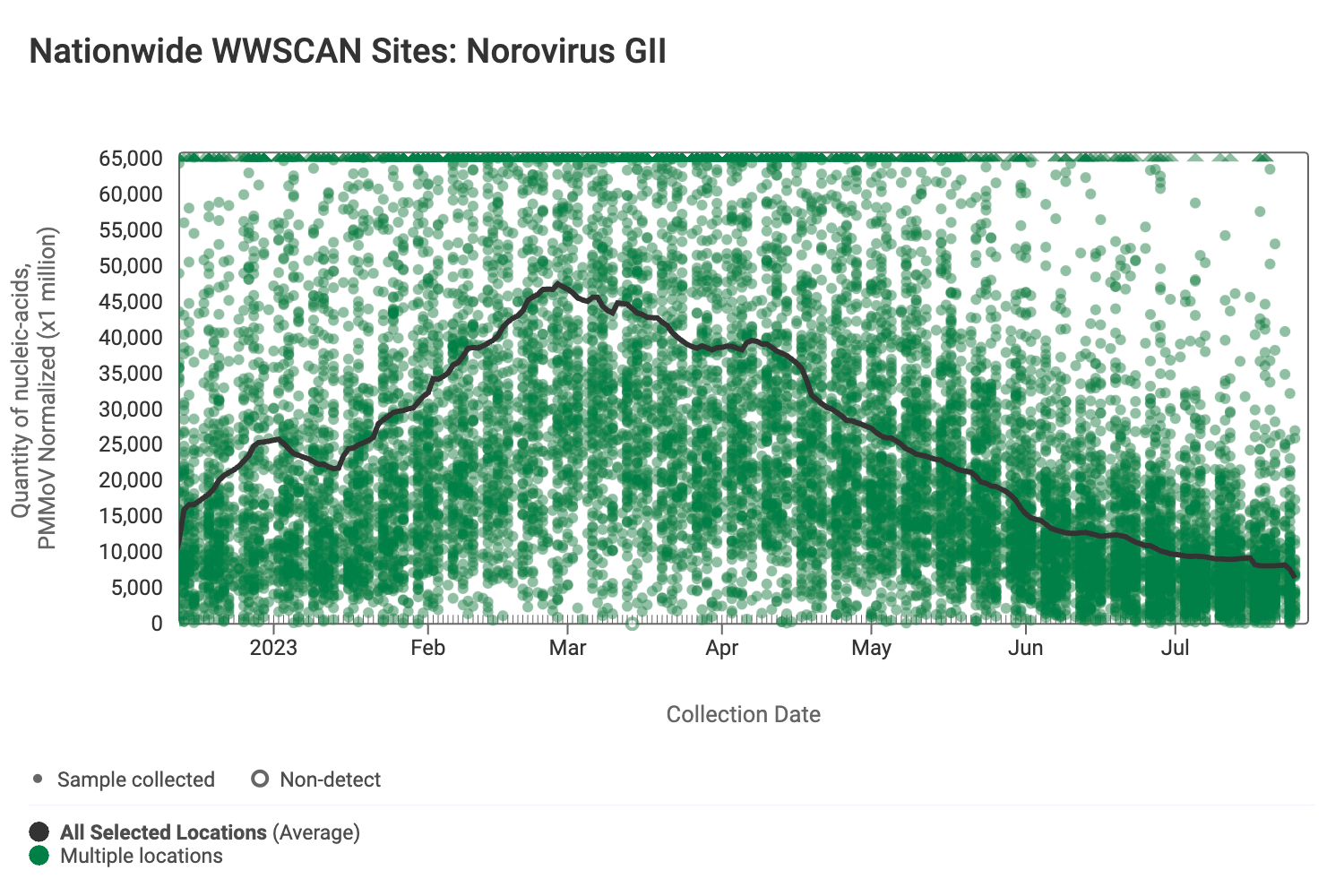 Norovirus GII (HuNoV GII) RNA has been consistently detected at the sites. The median concentration across all sites over the last 21 days is 2,807,893 copies/gram. Below are the HuNoV GII RNA concentrations (normalized by PMMoV) from all participating WWSCAN sites across the country.