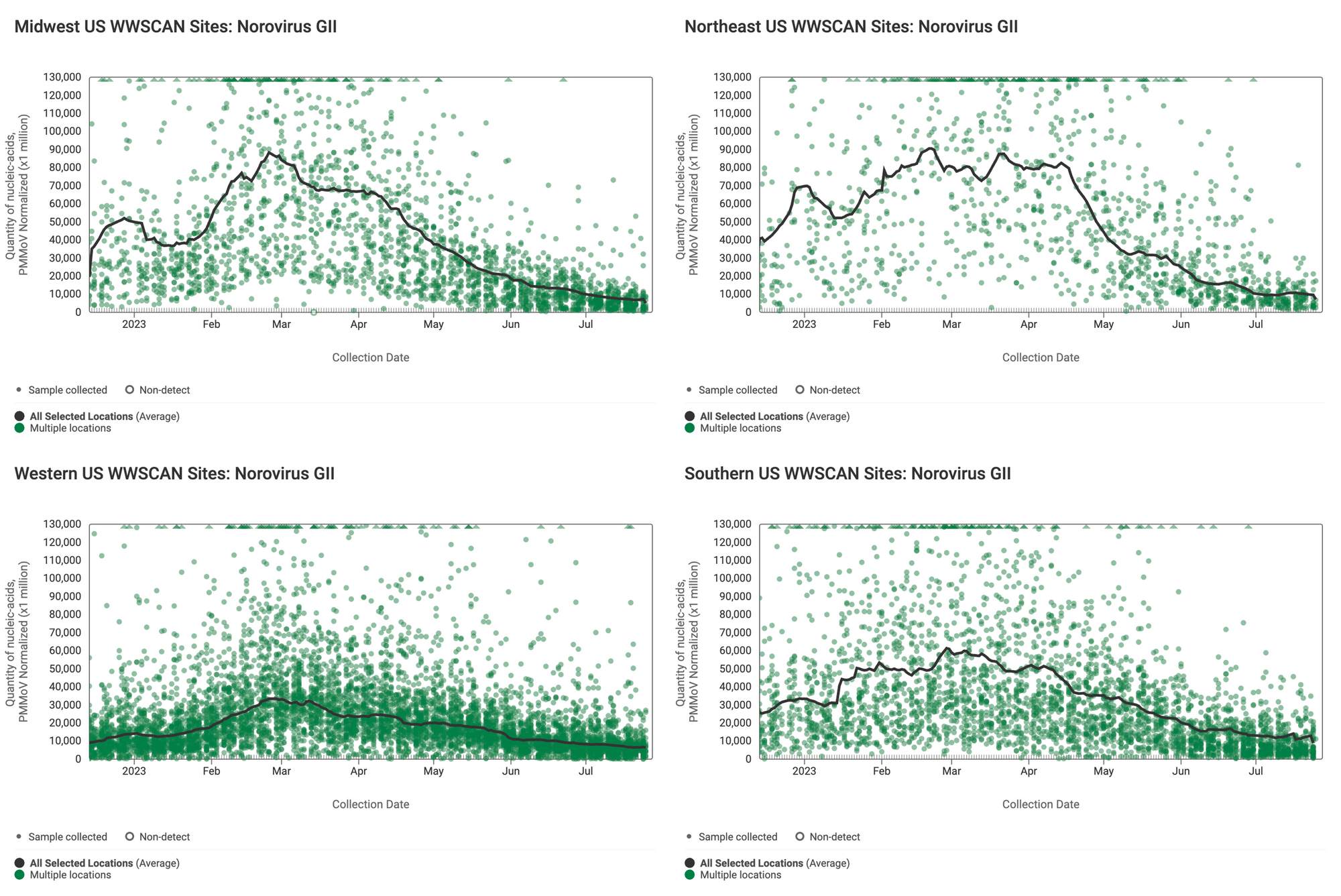 Below are the HuNoV GII RNA concentrations (normalized by PMMoV) from sites in the Midwest US (top left panel), Northeast US (top right panel), Southern US (bottom right panel) and Western US (bottom left panel). The population weighted average across regional WWSCAN plants is shown in black.