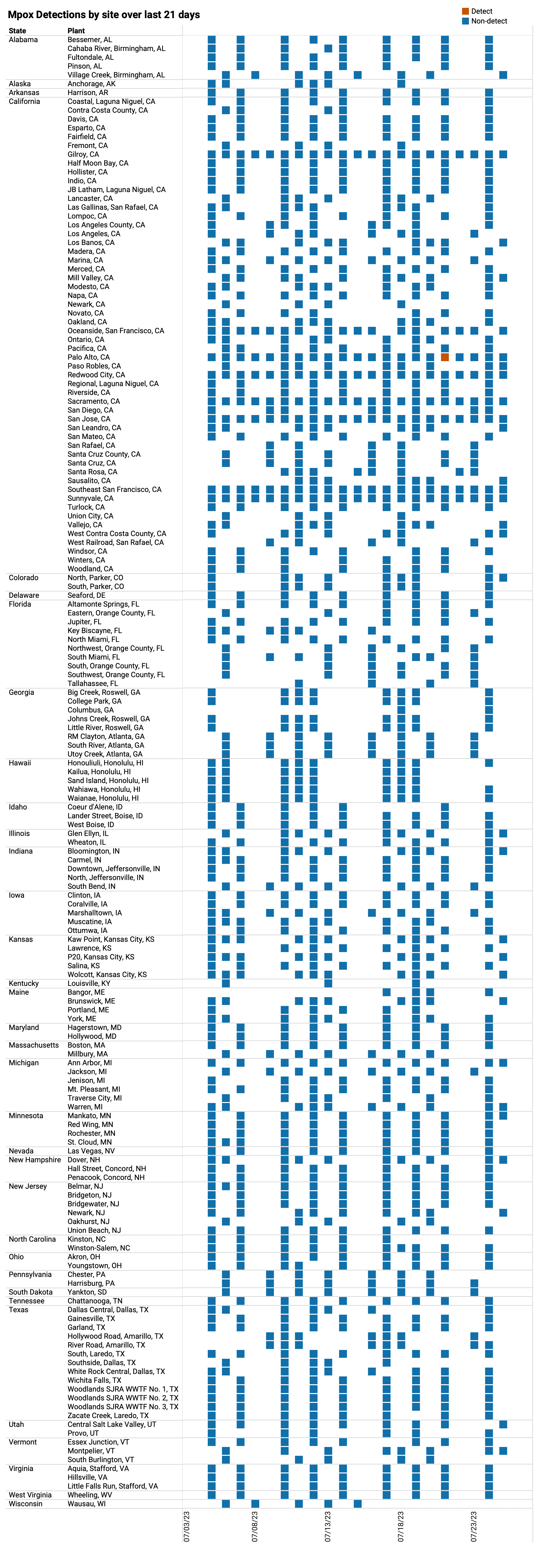 Mpox DNA We rarely detected mpox DNA in samples from any site over the past three-weeks. Below you can see, in red, there have only been 1 positive samples out of 1,465 samples during the past 21 days. Outbreaks seem to be under control, but we will continue to monitor so that public health departments can respond if we see consistent detections and increases in concentrations in any sites. The chart below shows every plant in WWSCAN (171) as rows, and the last 21 days as columns (labeled at the bottom axis). White indicates no samples, blue is non-detect for mpox DNA and red is detect for mpox DNA. As a reminder, you can access our paper in New England Journal of Medicine about how our mpox wastewater monitoring compares to clinical reports of infectious here.