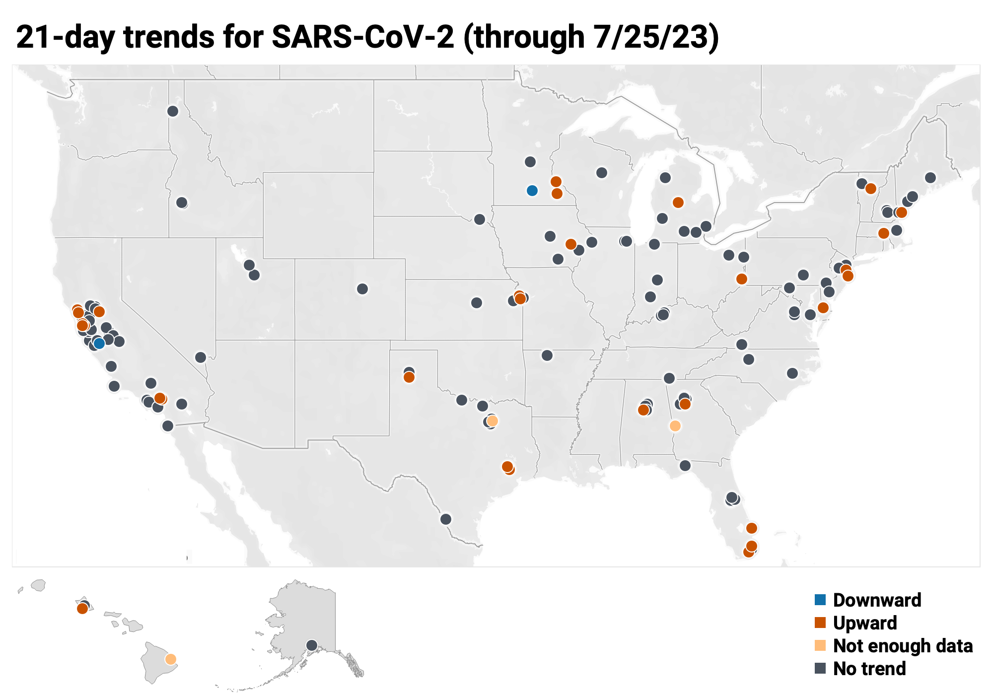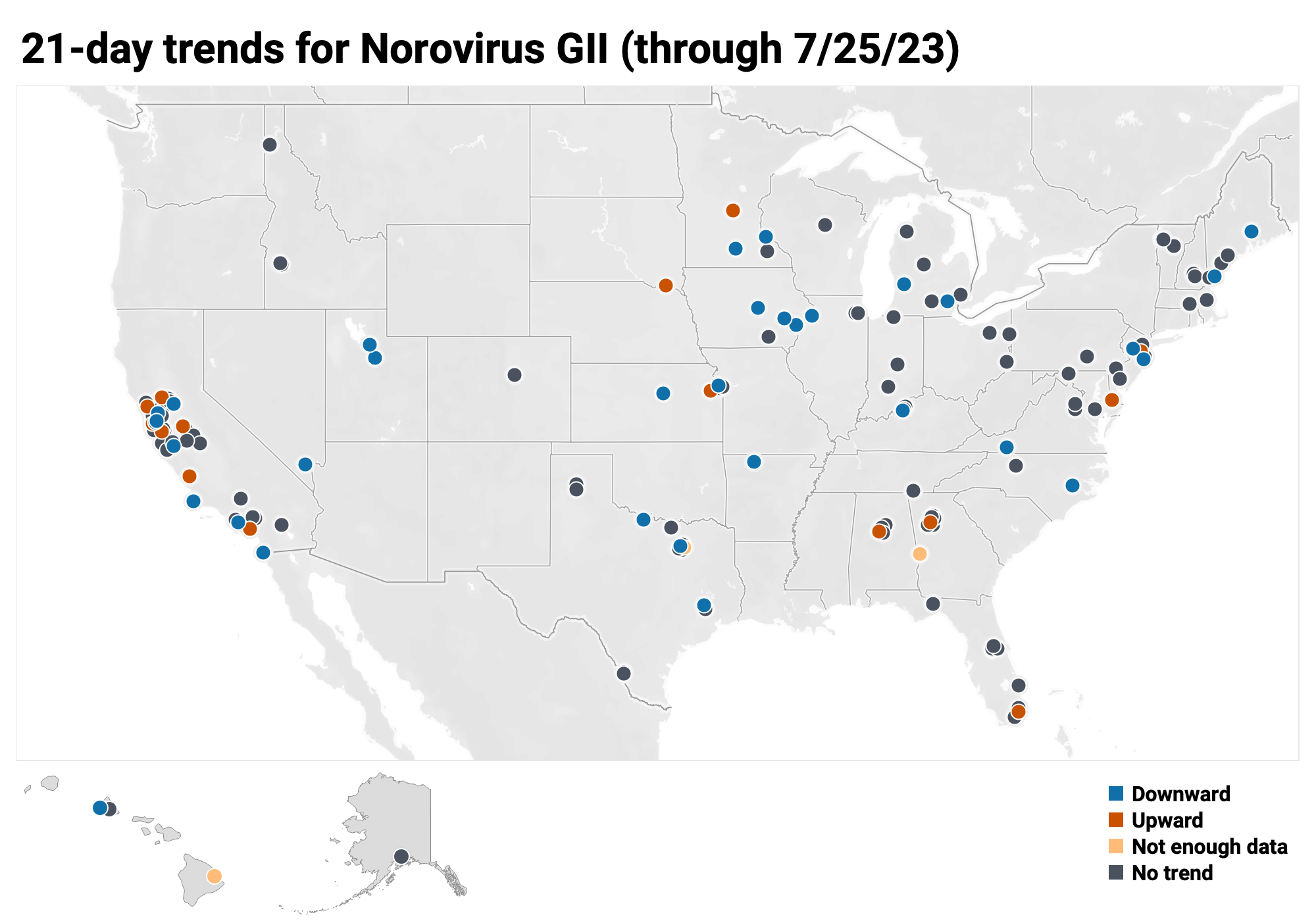 Below is the trend analysis for the SARS-CoV-2 RNA concentrations (N gene concentrations normalized by PMMoV) in wastewater solids at all participating plants. Red indicates a significant upward trend, blue is a significant downward trend, and dark grey is no trend. Yellow indicates that there were not enough data points to calculate a trend (we required 3 points over the last 21 days). You can read about our methods for trend analysis here. In short, we test for linear trends between log10-transformed concentration (target/PMMoV) and time; the trend must be classified as statistically significant (p<0.1).
