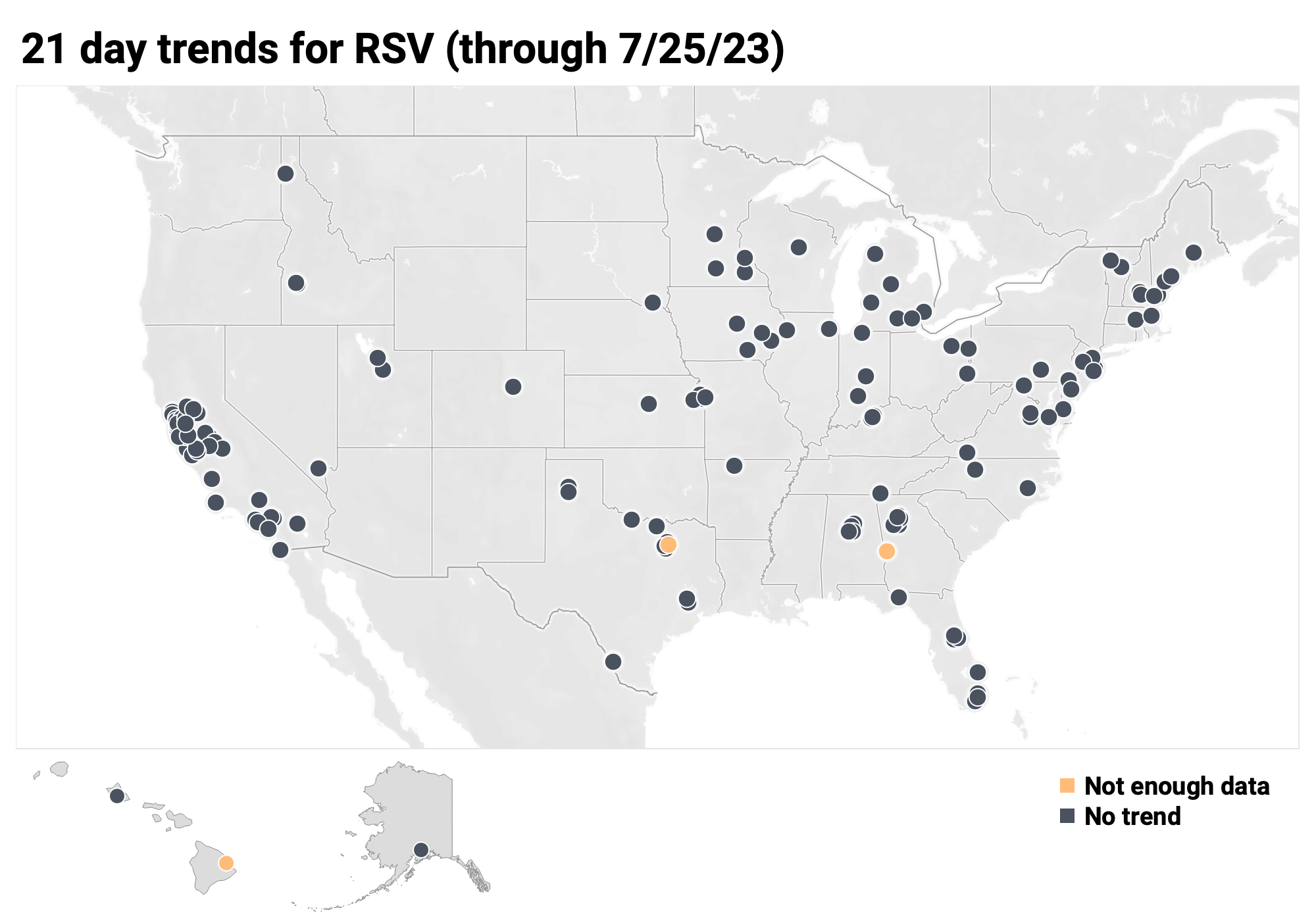 Below is the trend analysis for the RSV RNA concentrations (normalized by PMMoV) in wastewater solids at all participating plants. Red indicates a significant upward trend, blue is a significant downward trend, and dark grey is no trend. Yellow indicates that there were not enough data points to calculate a trend.