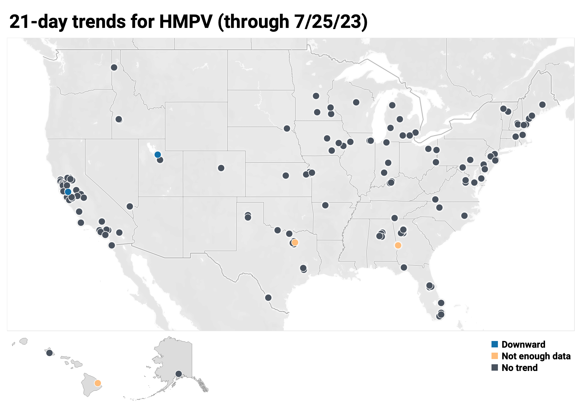 Below is the trend analysis for the HMPV RNA concentrations (normalized by PMMoV) in wastewater solids at all participating plants. Red indicates a significant upward trend, blue is a significant downward trend, and dark grey is no trend. Yellow indicates that there were not enough data points to calculate a trend.