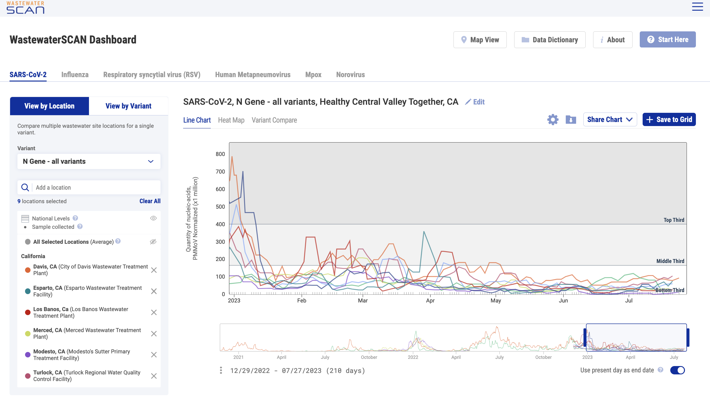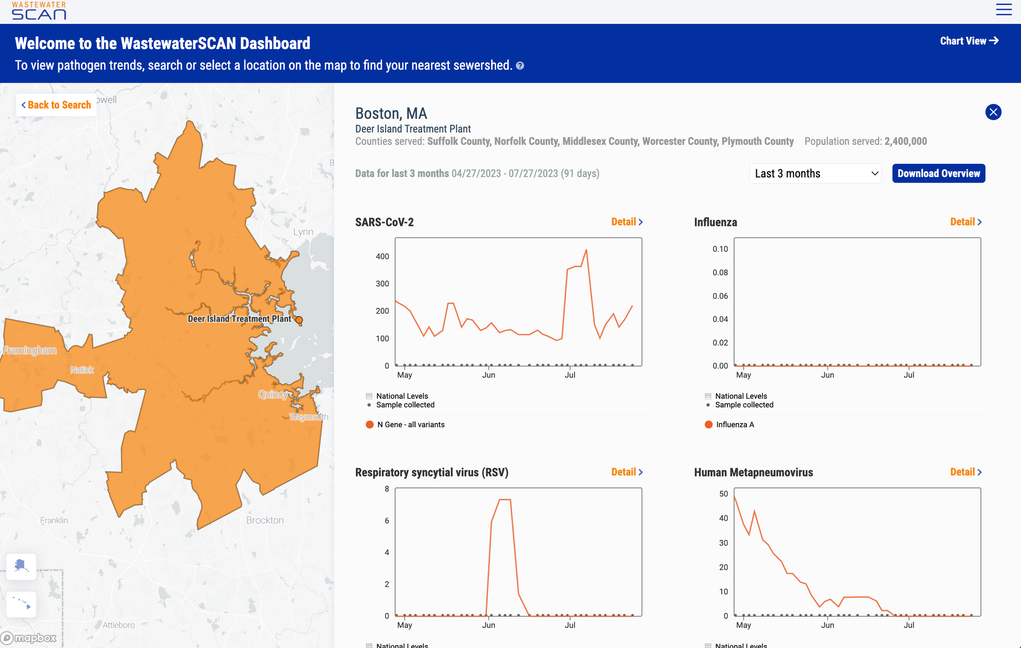 This newsletter contains updates on the WastewaterSCAN program with wastewater samples collected through July 25, 2023. Below you will find information on the program in terms of participating partners, review of targets being measured, as well as trends in concentrations of infectious disease targets.