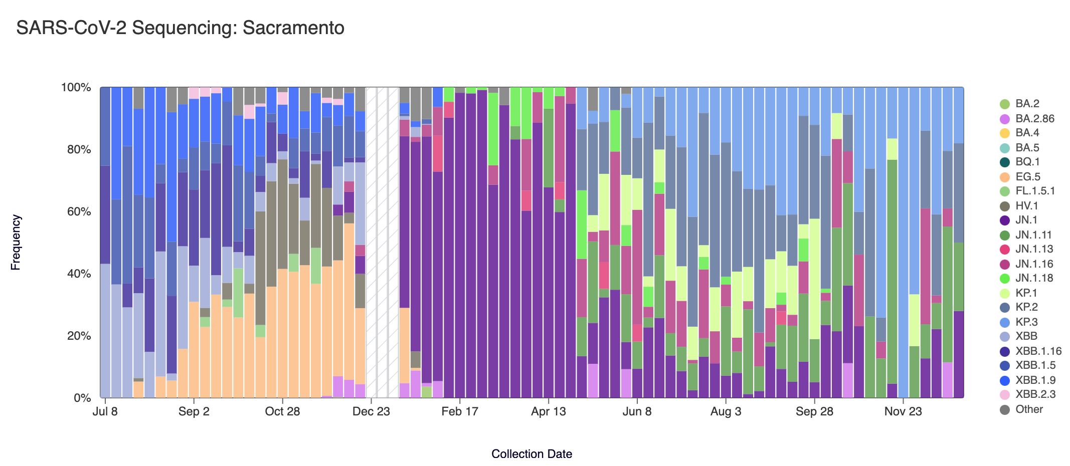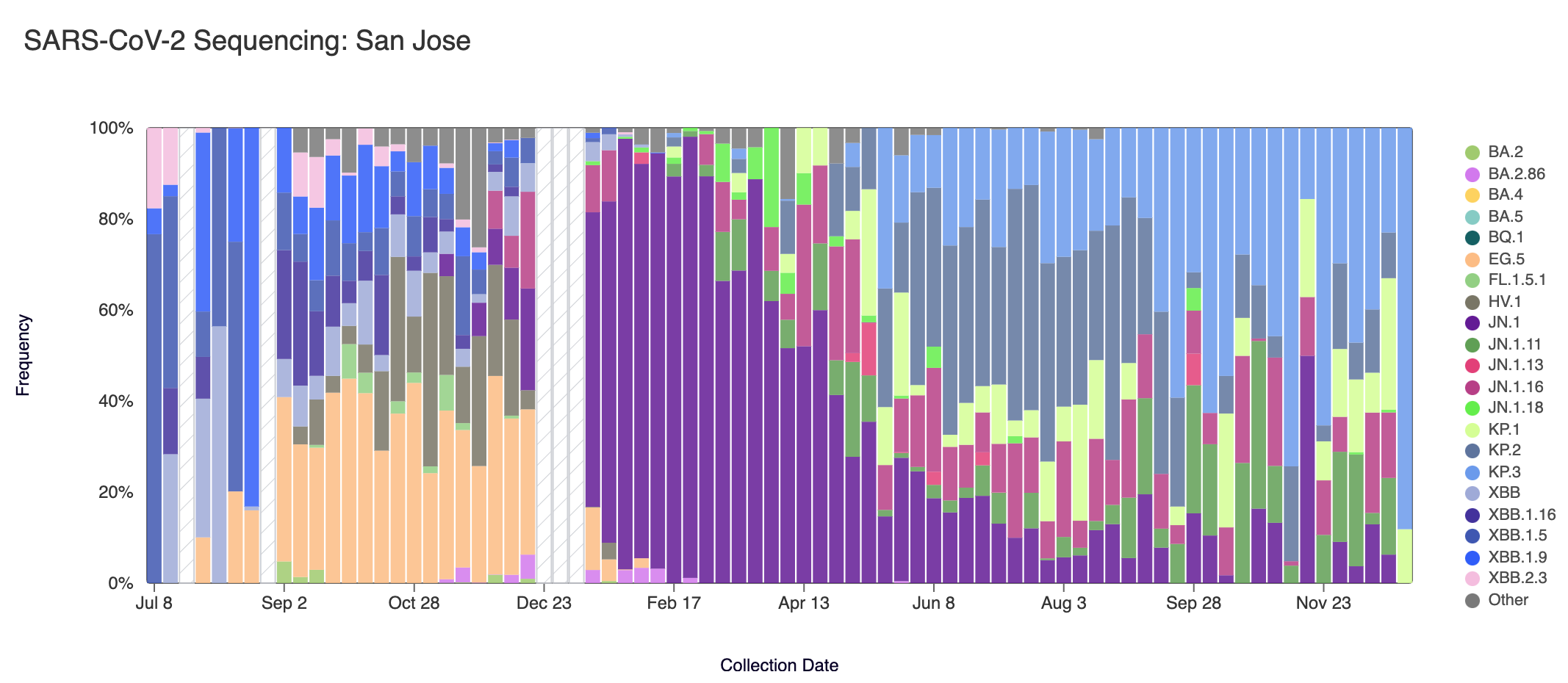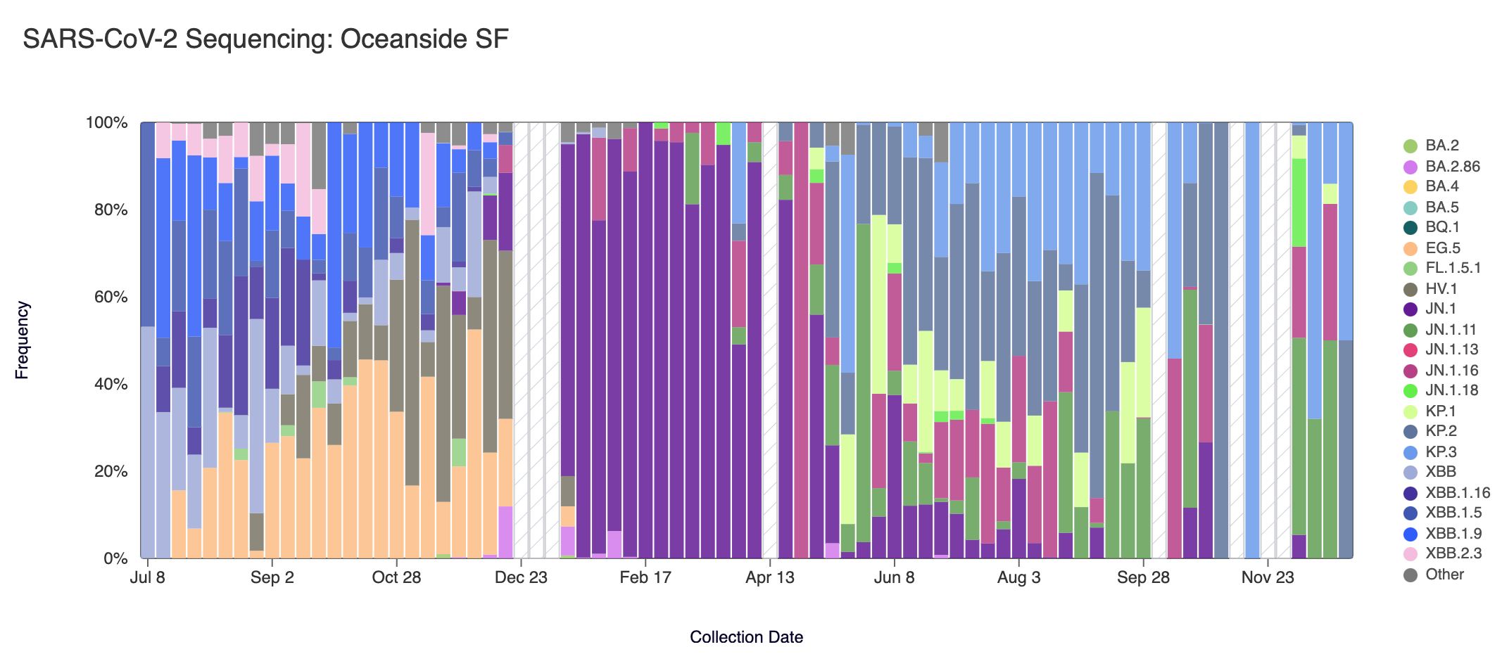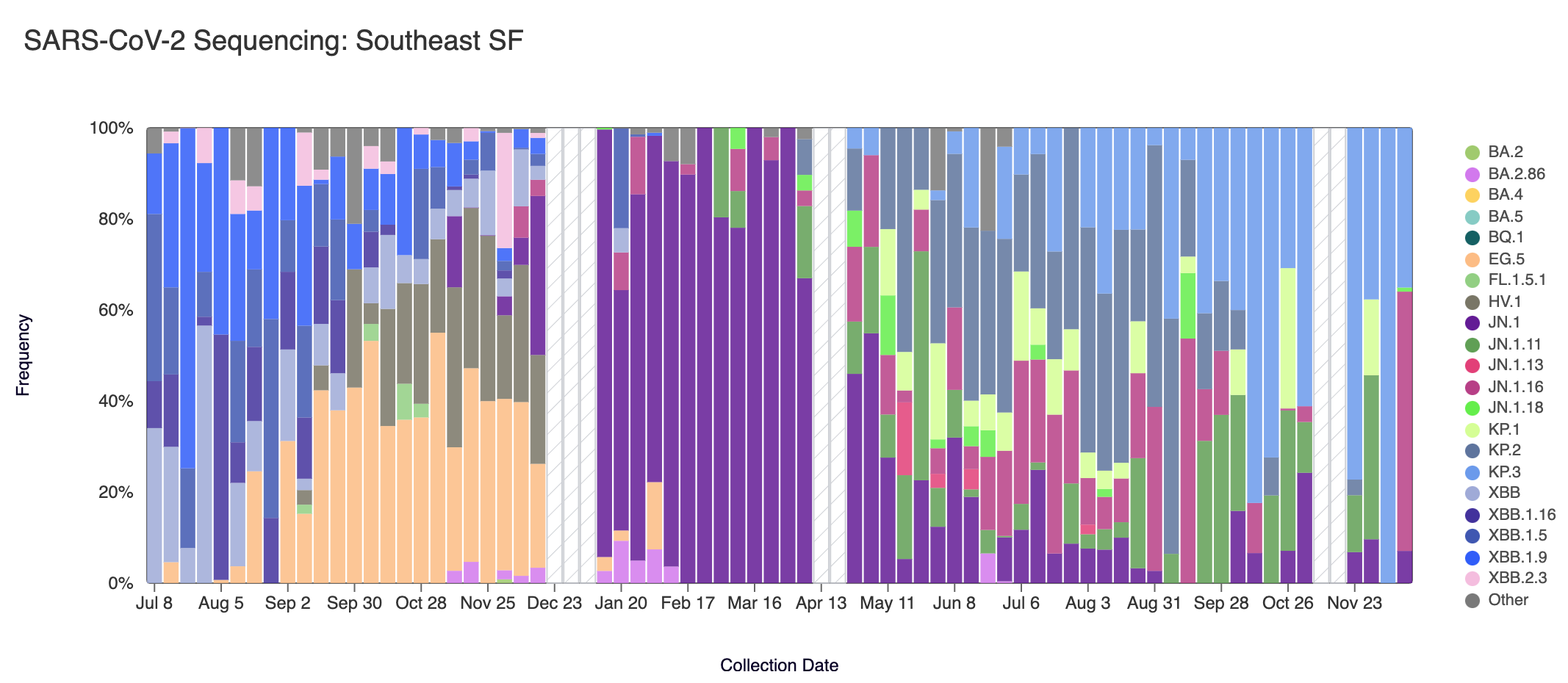 Note that the sequencing data are always from samples taken between 1-2 weeks ago (in this case, Dec 28, 2024). In the most recent samples, KP.2 made up the largest proportion of lineages detected at Sacramento (31.9%, KP.3 made up the largest proportion of lineages detected at San Jose (88.2%) and Oceanside SF (50%), and JN. 1.1.16 made up the largest proportion of lineages detected Southeast SF (56.9%).