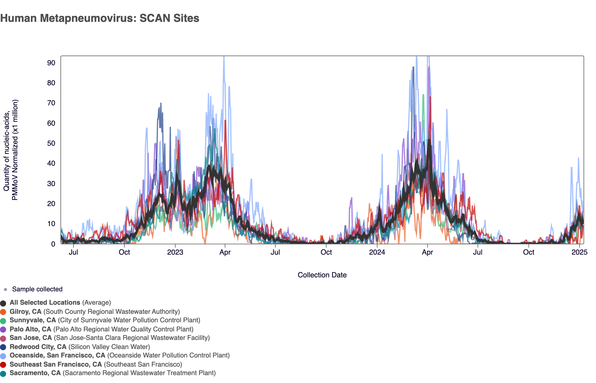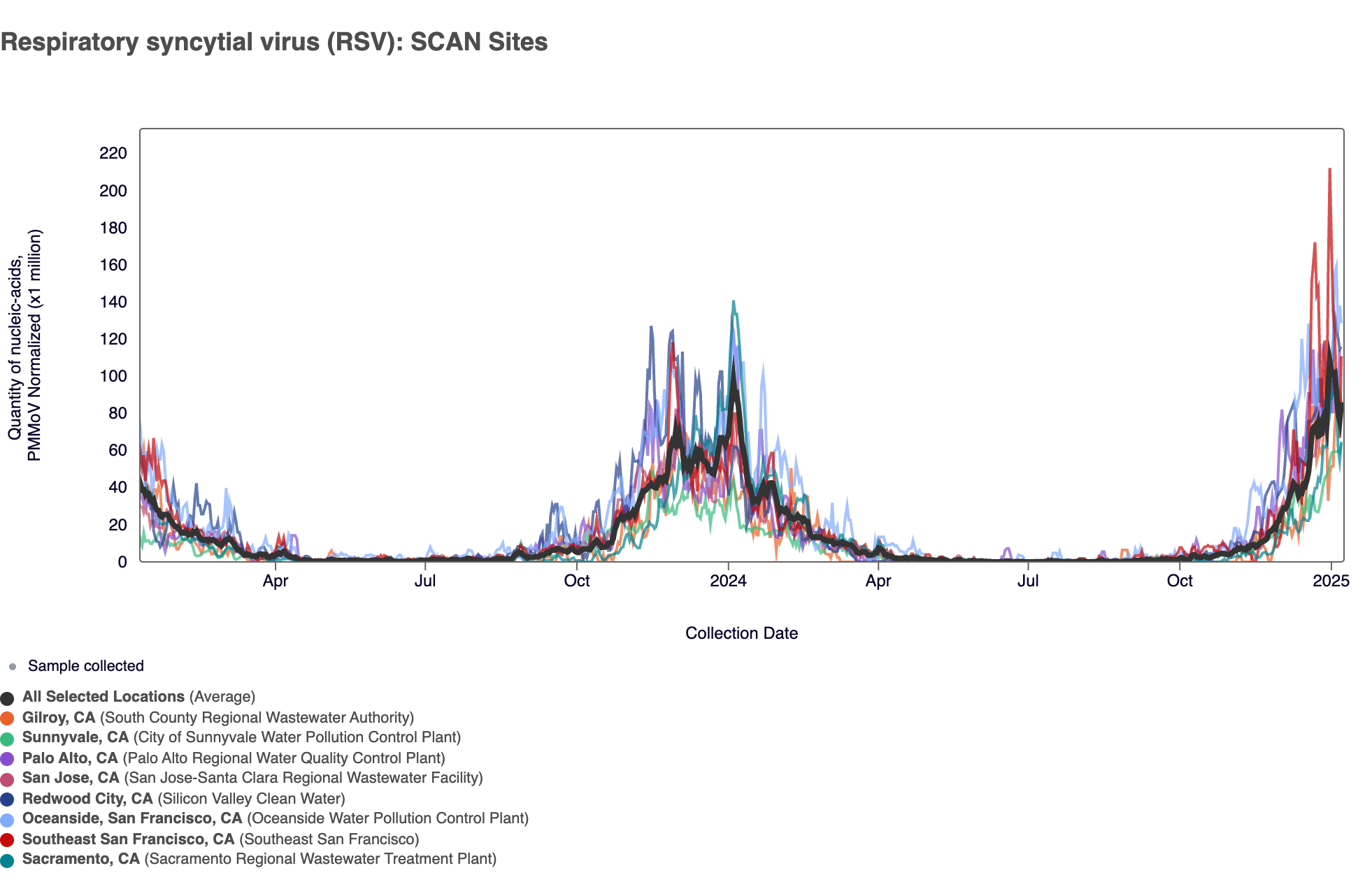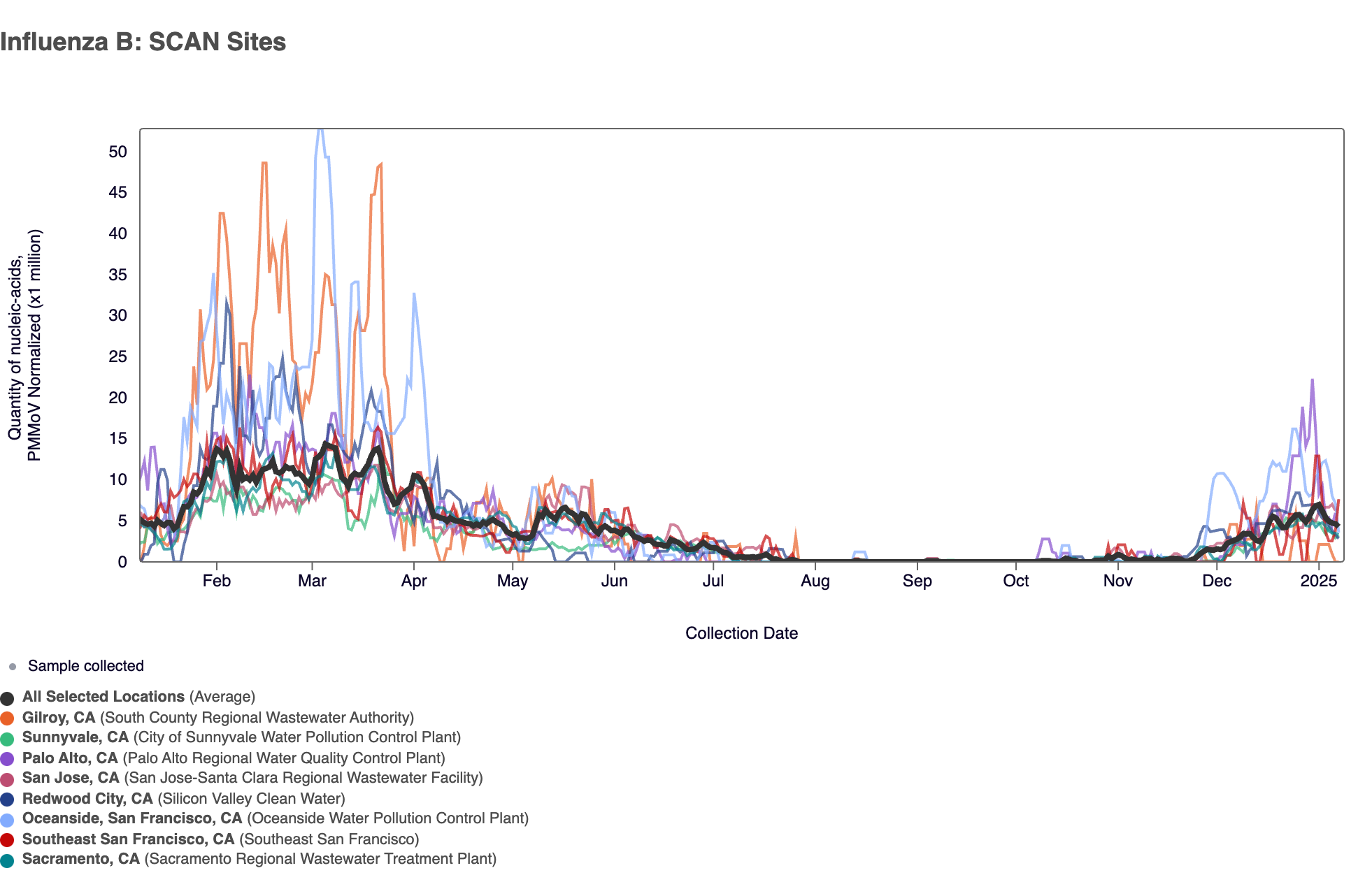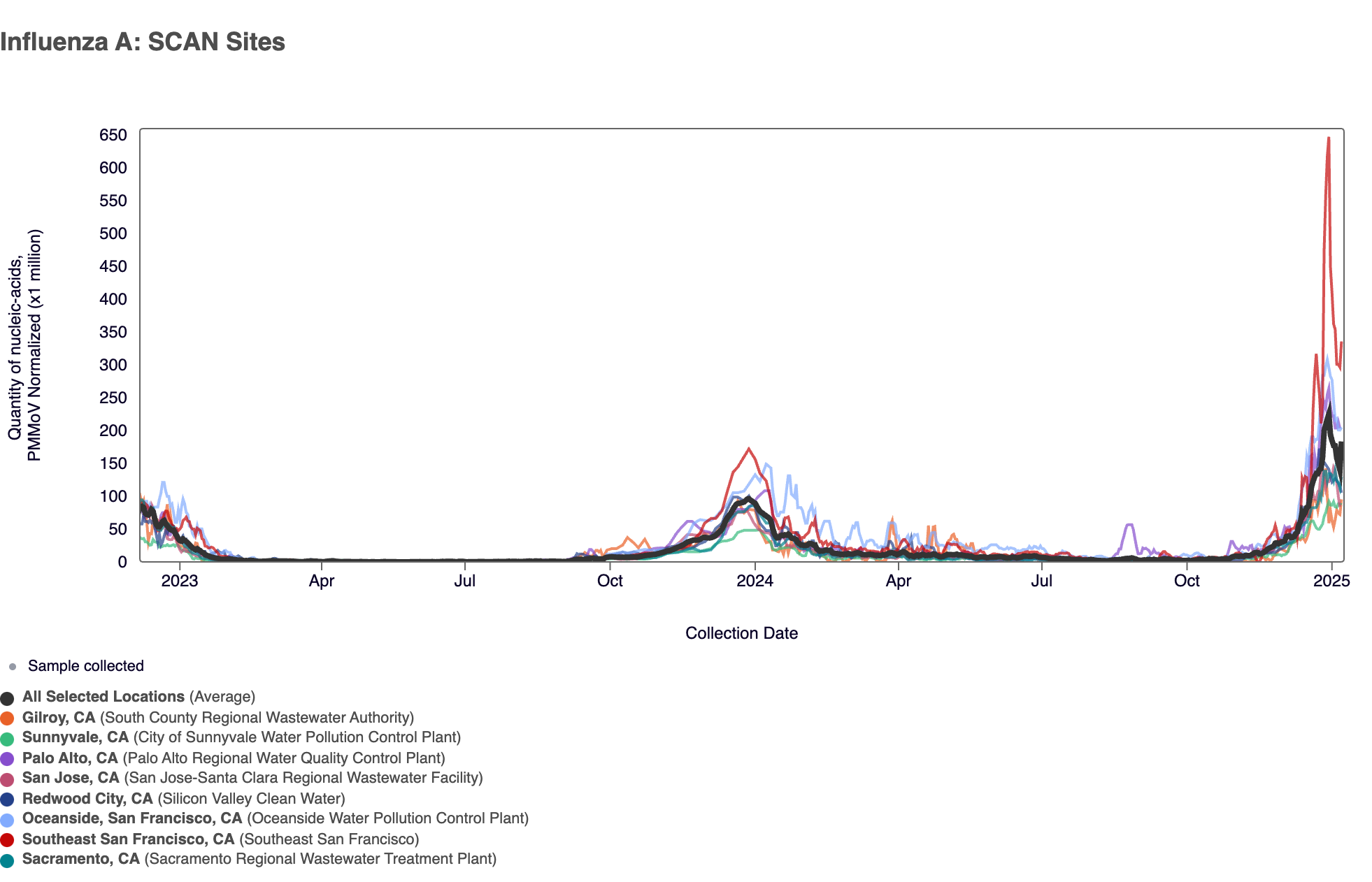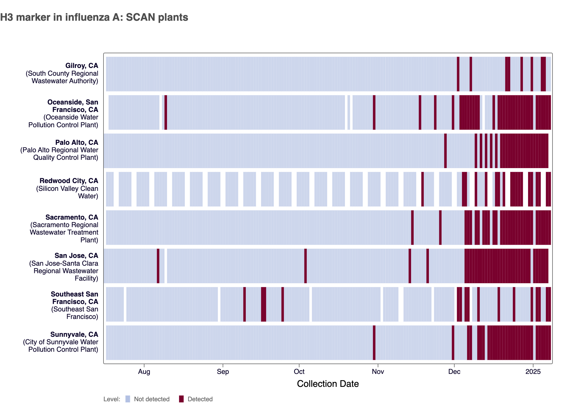 All 8 sites in the SCAN network (Gilroy, Oceanside SF, Palo Alto, Sacramento, San Jose, Southeast SF, SVCW, and Sunnyvale) have tested positive for the H3 marker in influenza A since we began testing for the marker prospectively in mid July 2024. We started seeing consistent positive detections of the H3 marker in Dec 2024.