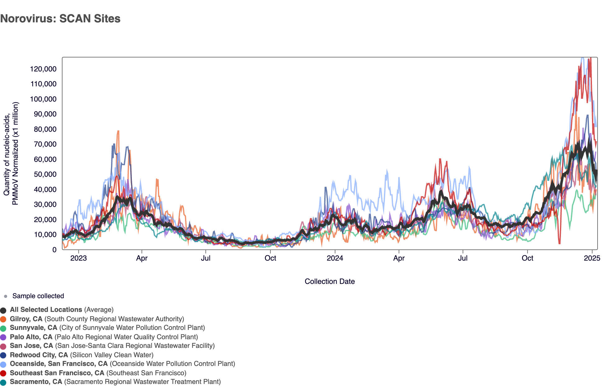 The plot below shows the Norovirus concentrations at the SCAN sites since we began monitoring in late 2022. The population weighted average line is shown in black. You can interact with the chart of all the plants at this link.