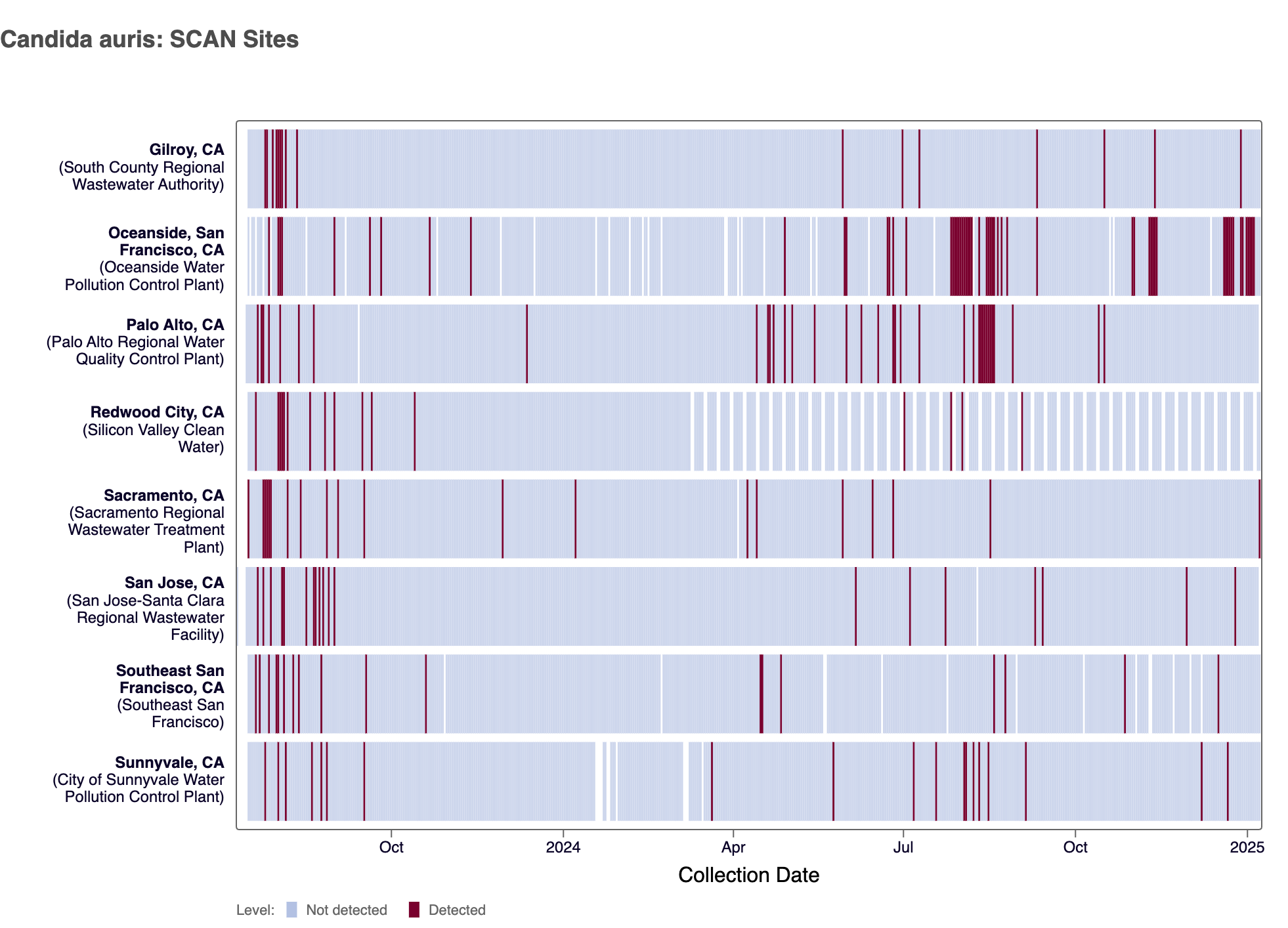 Candida auris DNA was detected at 5 SCAN sites in the last 3 weeks (San Jose and Sunnyvale). Currently 7 SCAN sites are in the 'LOW' category for C. auris and Oceanside SF is in the 'MEDIUM' category for C. auris.