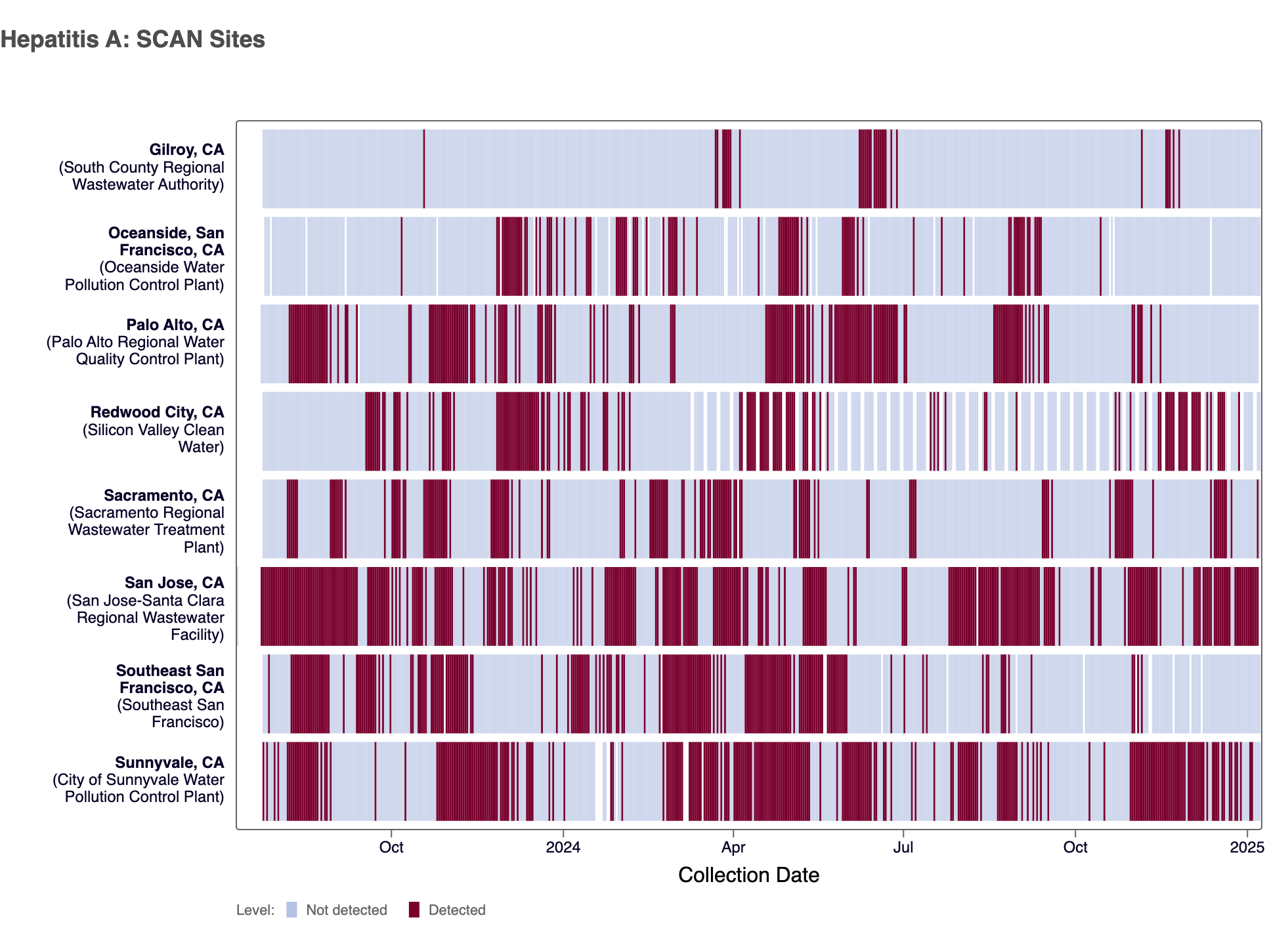 Hepatitis A RNA was detected at 4 of the SCAN sites (Sacramento, San Jose, SVCW and Sunnyvale) in the last 3 weeks.