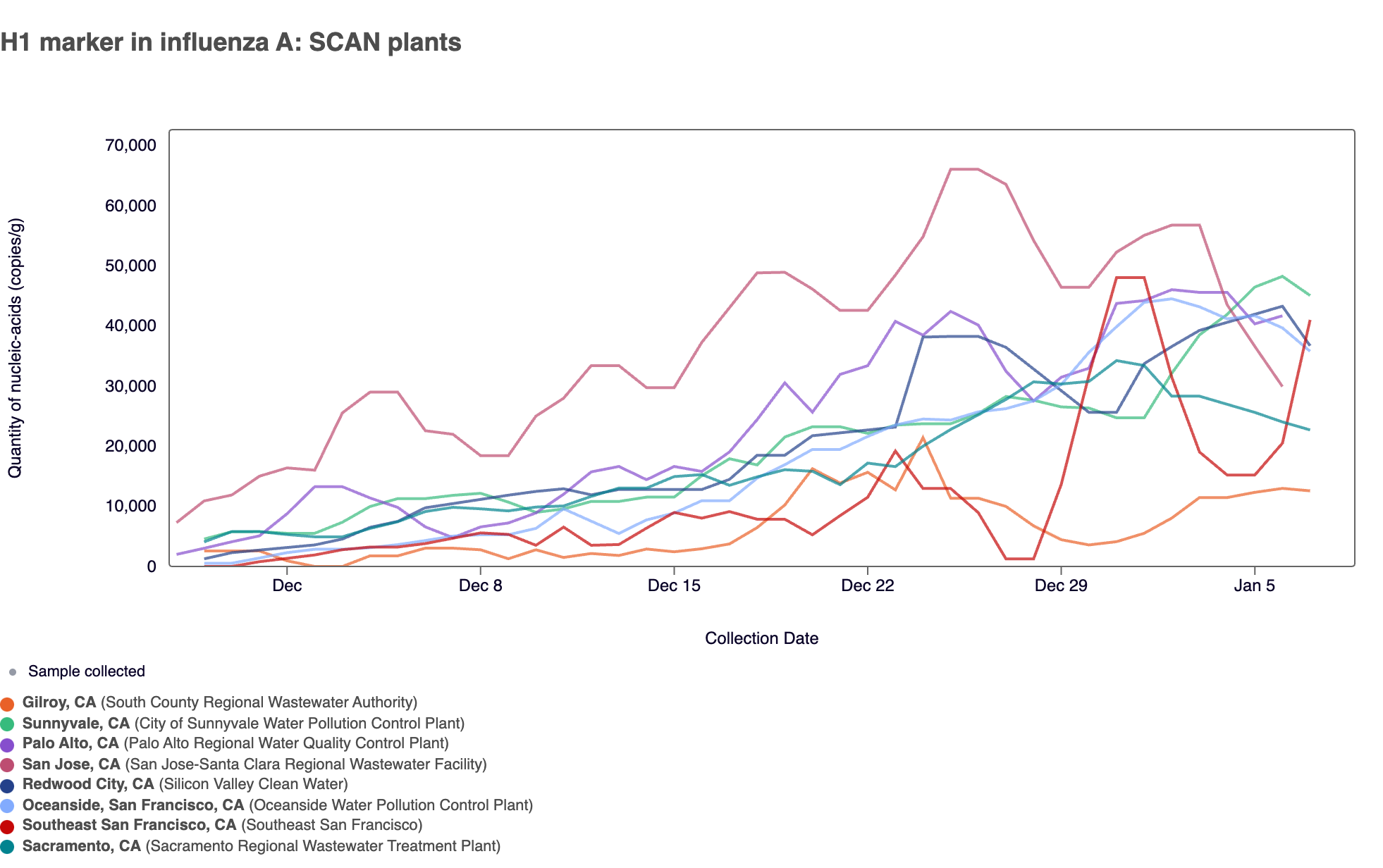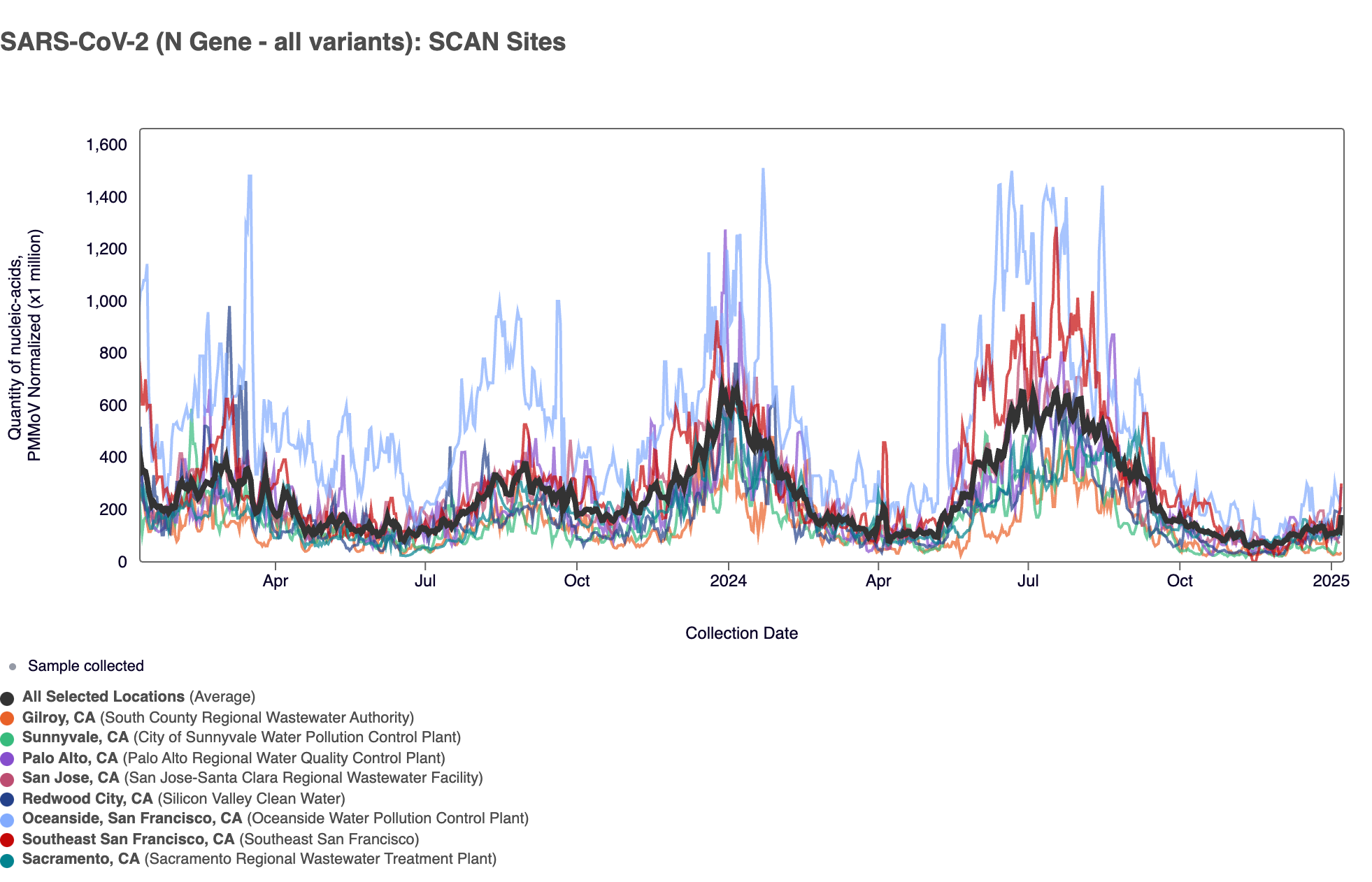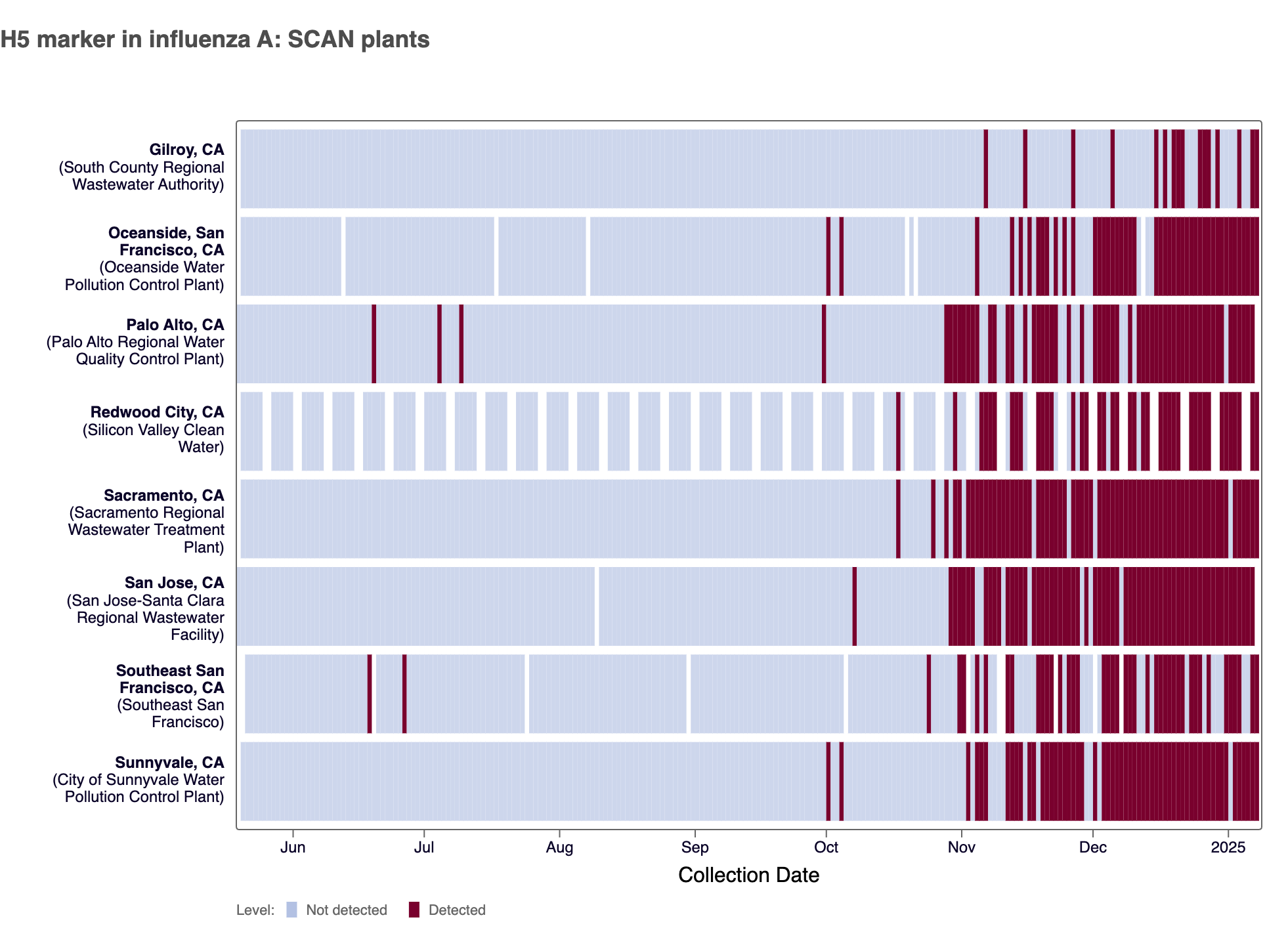 All 8 sites in the SCAN network (Gilroy, Oceanside SF, Palo Alto, Sacramento, San Jose, Southeast SF, SVCW, and Sunnyvale) have tested positive for the H5 marker in influenza A since we began testing for the marker prospectively in May 2024.