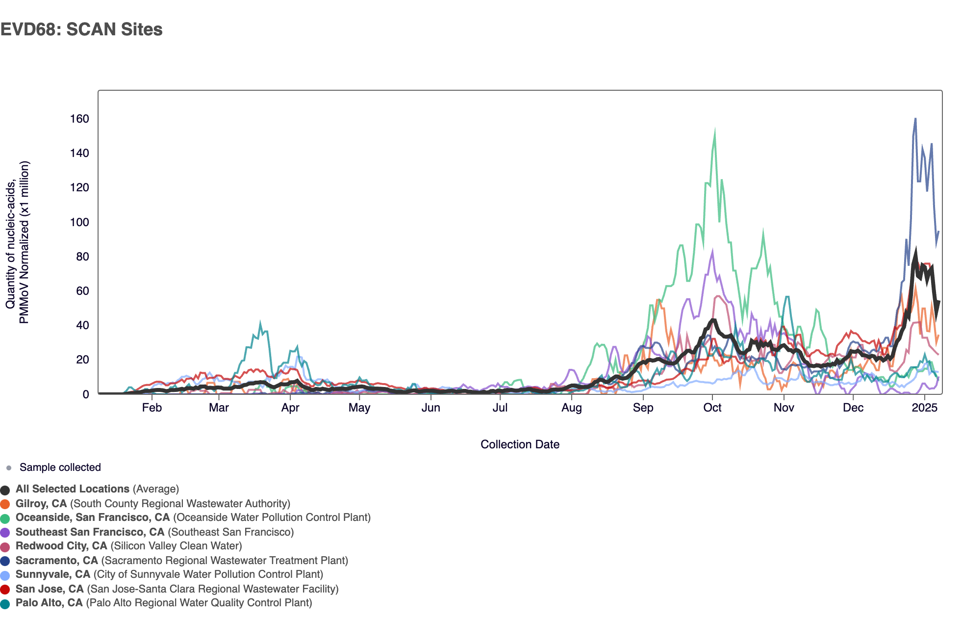 In the chart below, the population weighted average line across all the SCAN plants is shown in black over the last 12 months. Evident in the chart were increasing EV-D68 concentrations in early August 2024, concentrations plateauing in early November 2024 to late December 2024 before beginning to rise again at the start of 2025.