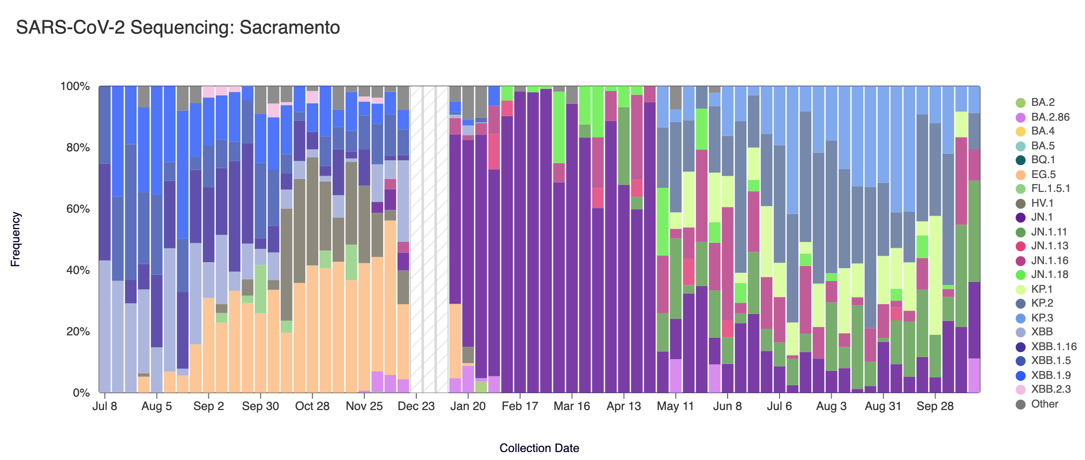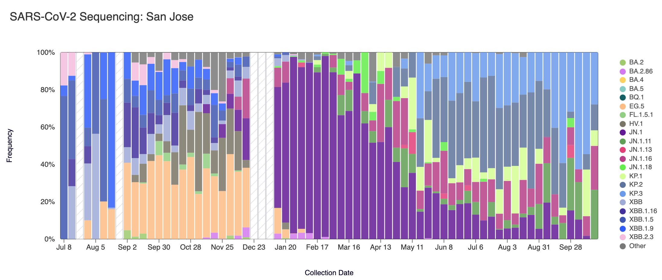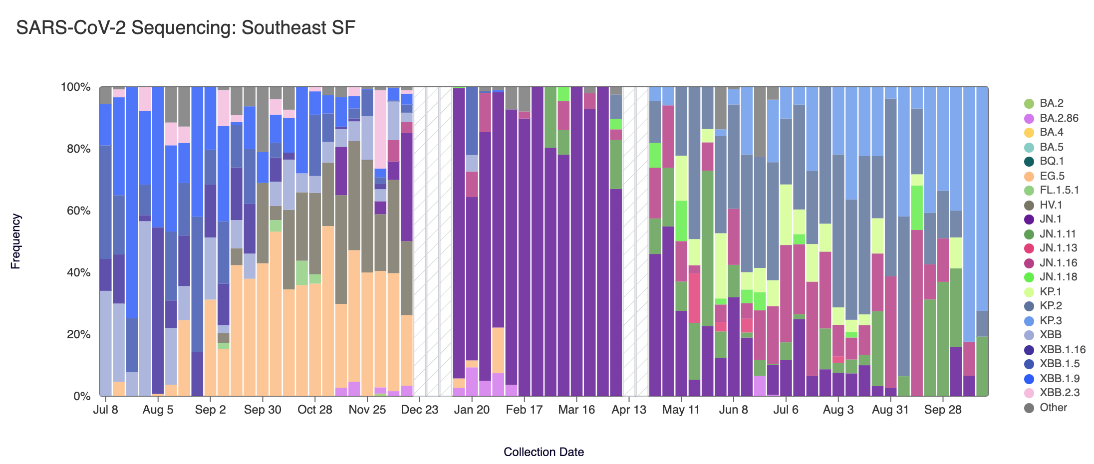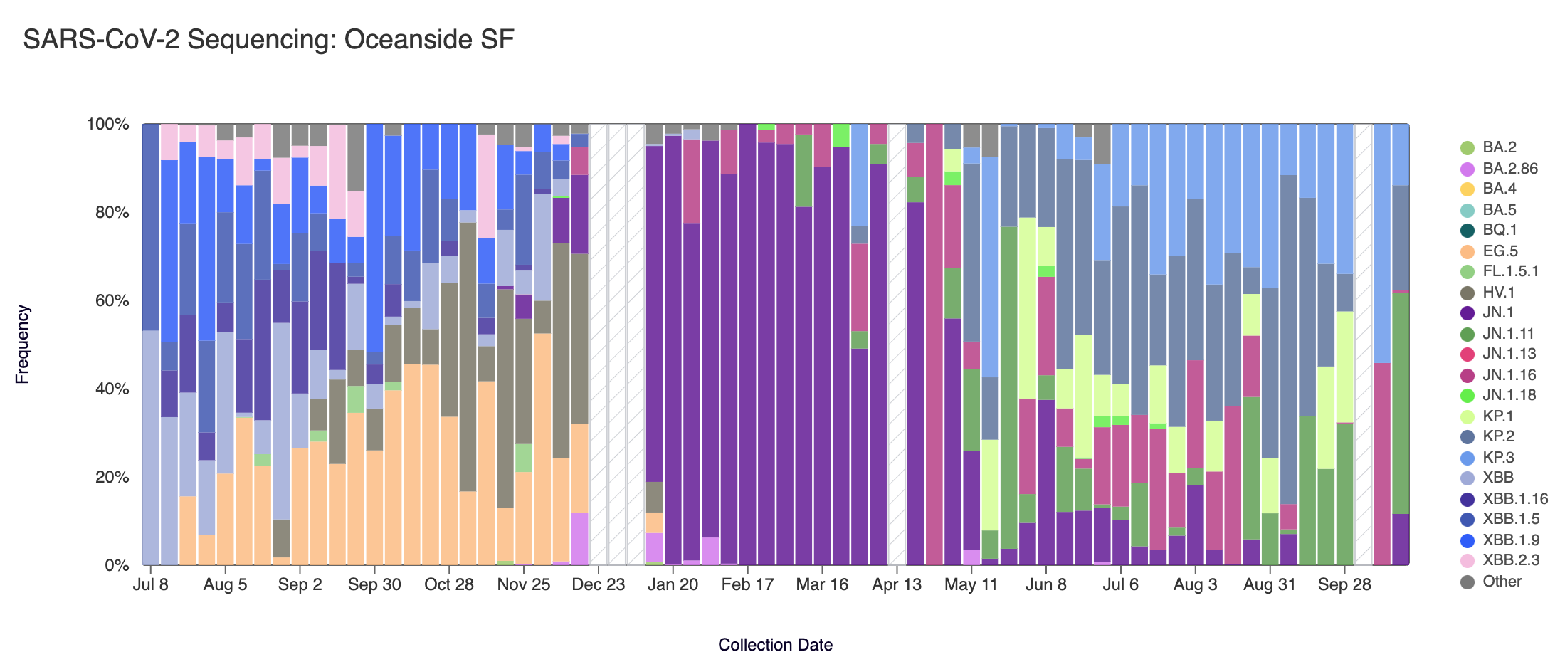 Below are plots from Oceanside SF, Sacramento, San Jose, and Southeast SF showing the relative proportions of different variants inferred from sequencing the entire genome of SARS-CoV-2. White and grey striped bars indicate no data is currently available for that week. In the most recent samples, KP.3 made up the largest proportion of lineages detected at Southeast SF (72.4%), and JN.1.11 made up the largest proportion of lineages detected at Oceanside SF (50%), Sacramento (33%), and San Jose (26.4%). Note that the sequencing data are always from samples taken between 1-2 weeks ago (in this case, Oct 19, 2024).