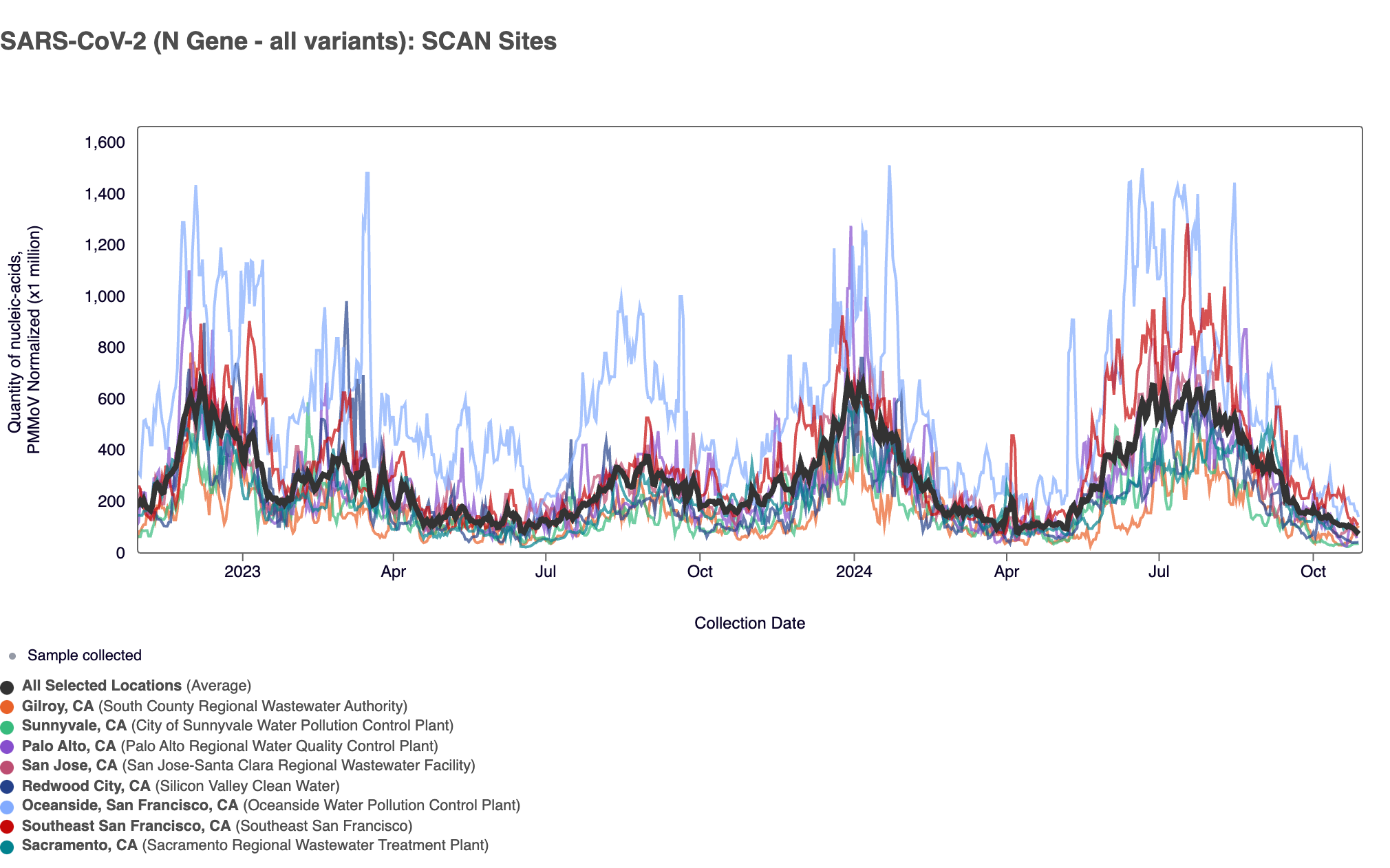 Below are all the data from all the SCAN plants for the last two years. You can access the graph here. The population weighted average across the SCAN plants is shown in black. The population weighted average has come down from the peak observed in this summer (July/August 2024).