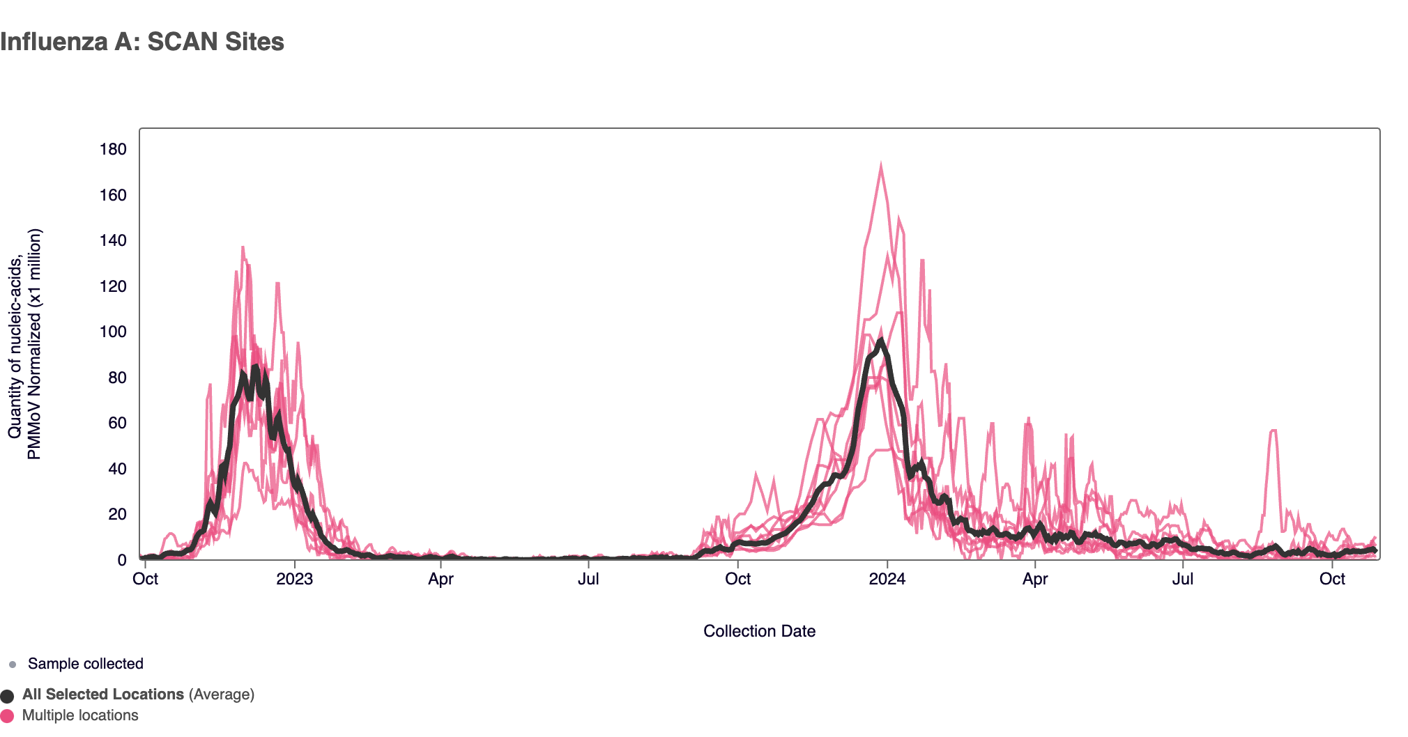 Influenza A (IAV) RNA: Below are all the IAV data from all the SCAN plants for the last two years. You can access the graph here. The population weighted average across the SCAN plants is shown in black.