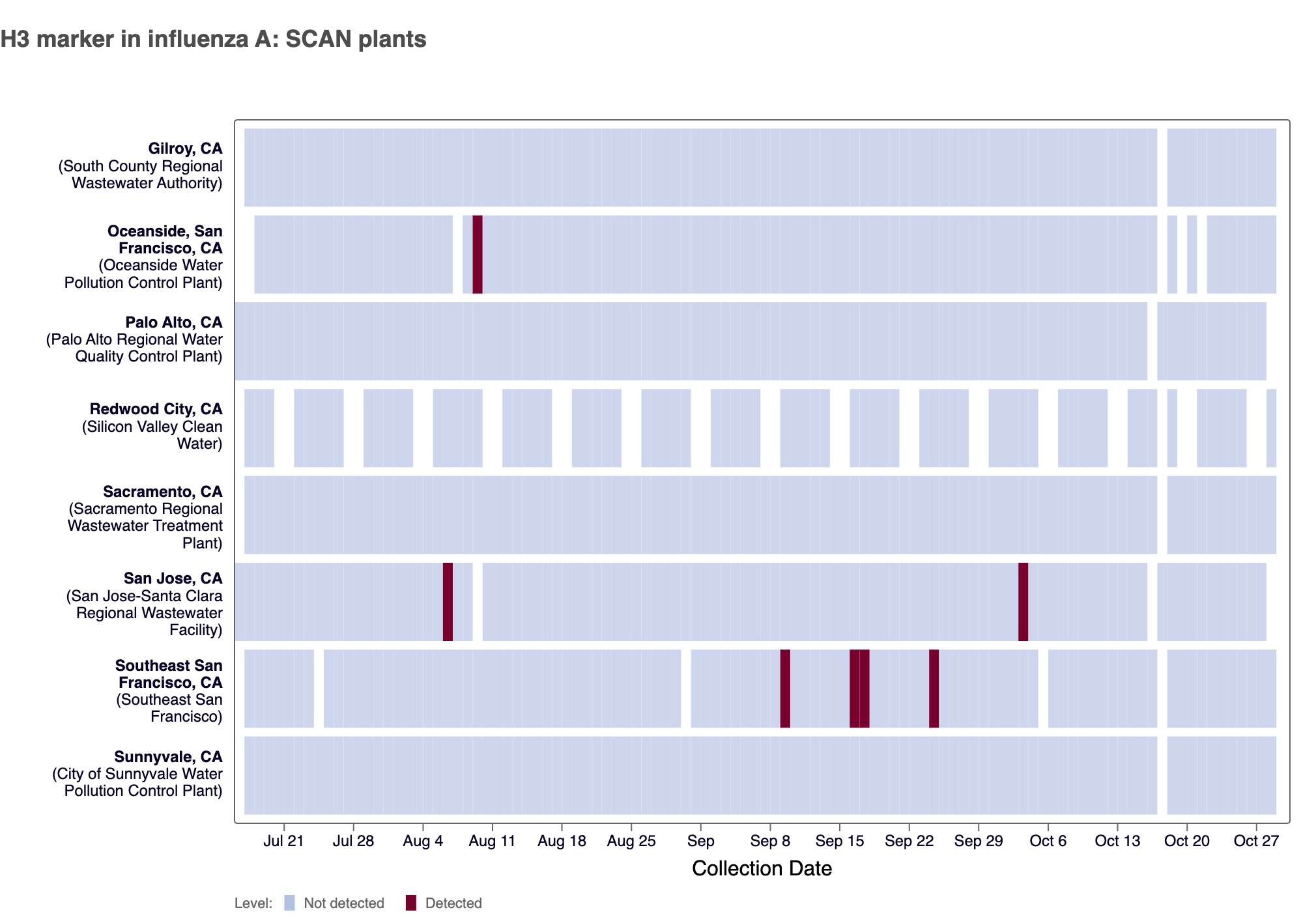 3 sites in the SCAN network (Oceanside SF, Southeast SF, and San Jose) have tested positive for the H3 marker in influenza A since we began testing for the marker prospectively in mid July 2024.