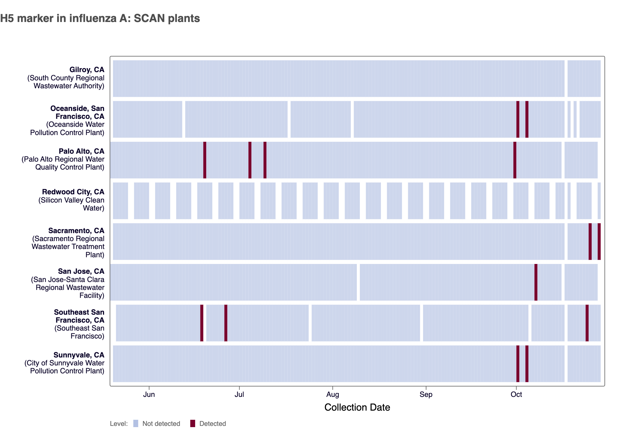 6 sites in the SCAN network (Oceanside SF, Palo Alto, Sacramento, San Jose, Southeast SF, and Sunnyvale) have tested positive for the H5 marker in influenza A since we began testing for the marker prospectively in May 2024. In the past 21 days, 2 sites (Sacramento and Southeast SF) have tested positive for the H5 marker.