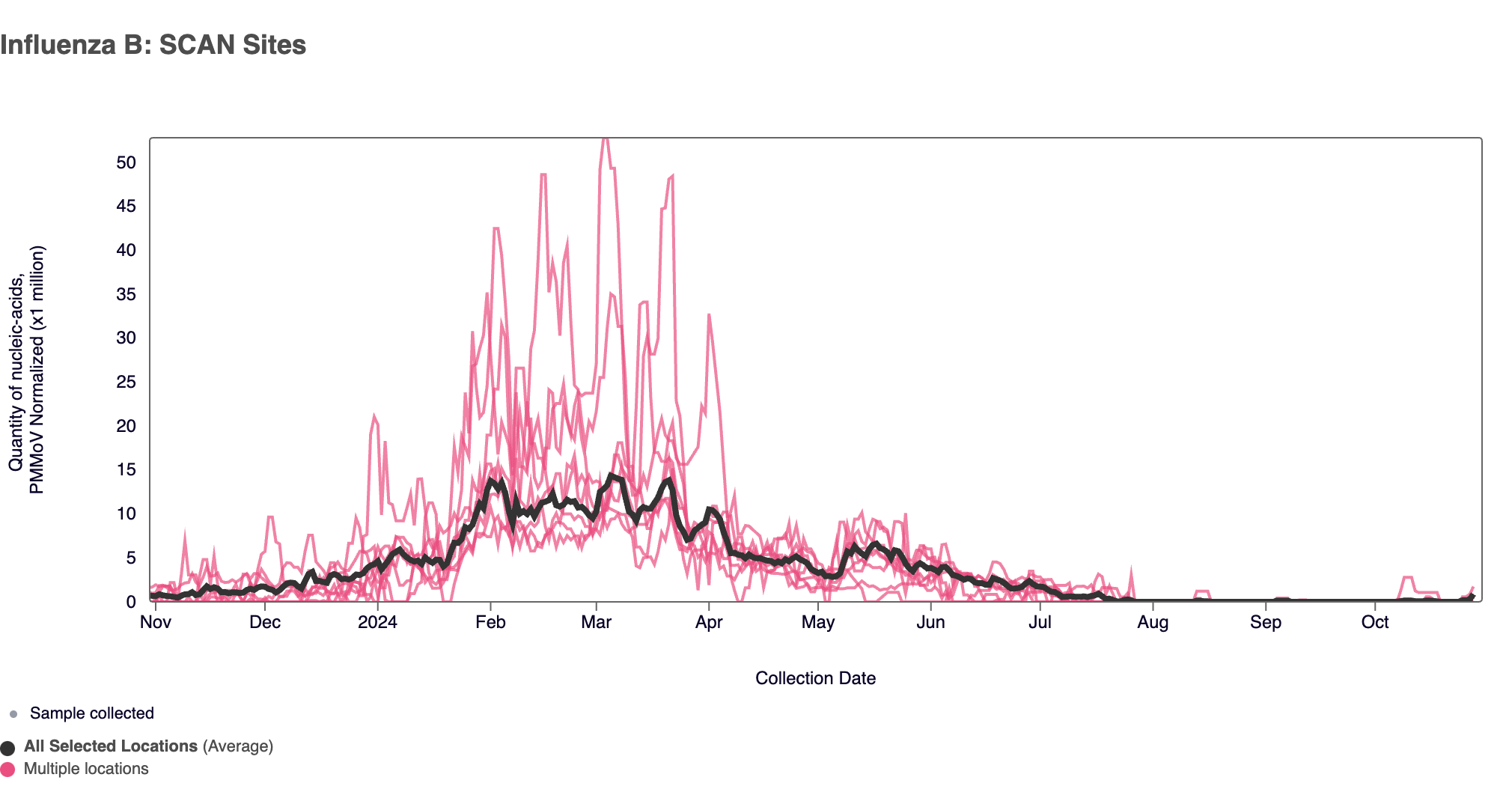 Influenza B (IBV) RNA has rarely been detected in samples collected from SCAN sites in the last 3 weeks. In the chart below (representing data from the past 1 year), the population weighted average across the SCAN plants is shown in black. You can access the graph here.