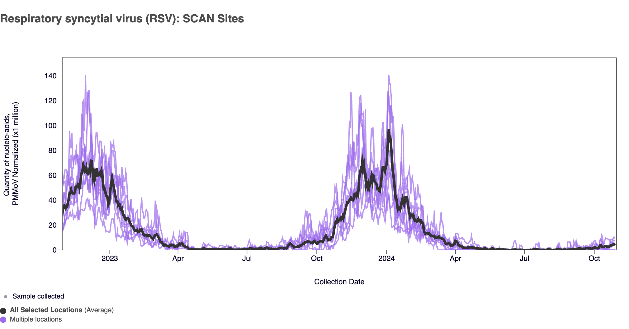 RSV RNA has regularly been detected in samples collected from SCAN sites (expect Gilroy) in the last 3 weeks. In the chart below (representing data from the past 2 years), the population weighted average line across all the SCAN sites is shown in black, and you can see the current concentrations relative to the peak RSV levels from late last year. The link to the chart below is here if you would like to interact with it.