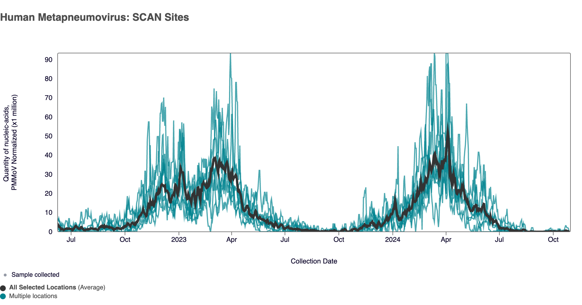 In the chart below, the population weighted average line across all the SCAN plants is shown in black (link here to this chart if you want to interact with it) since we started monitoring HMPV at SCAN sites. Evident in the chart are the very low HMPV concentrations across all SCAN sites.