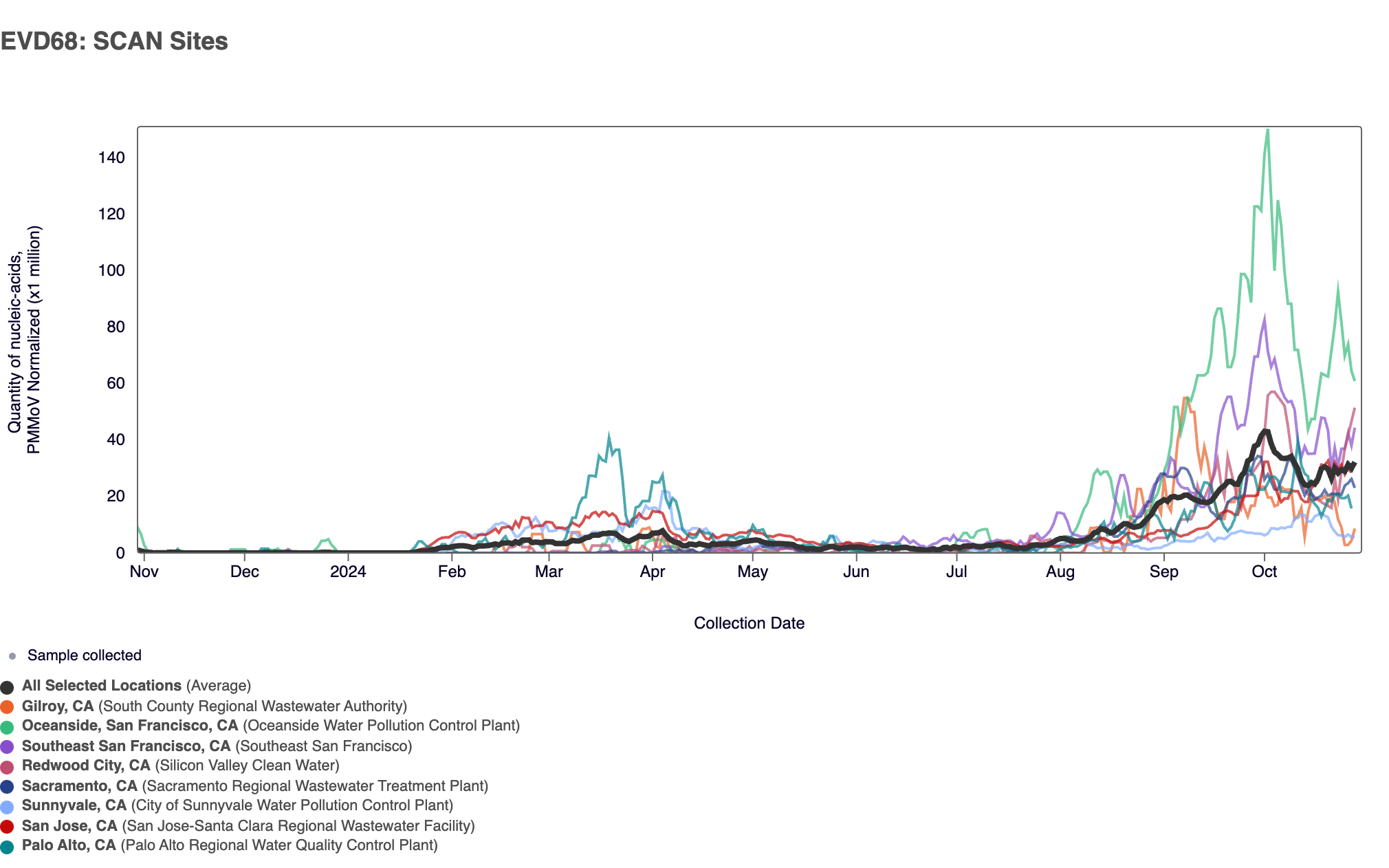 EV-D68 RNA was consistently detected from samples collected at all SCAN sites in the last 3 weeks. EVD68 RNA was rarely detected in wastewater solids since we began monitoring through August 2024. However, this year we have seen an increase in detection and it is showing characteristics more consistent with a seasonal epidemic pathogen this year. Therefore, we changed its classification for determining the WastewaterSCAN wastewater category from “Not commonly detected (regardless of season)” to “Seasonal detected (rarely detected outside of season/outbreaks)” starting October 15, 2024. It has always been the plan that a “not commonly detected” pathogen could be moved to another category archetype when appropriate, and this change will provide category determinations based on the quantitative measurement of EV-D68 rather than just detections. You can read more about how wastewater categories are calculated here: https://data.wastewaterscan.org/about/#8