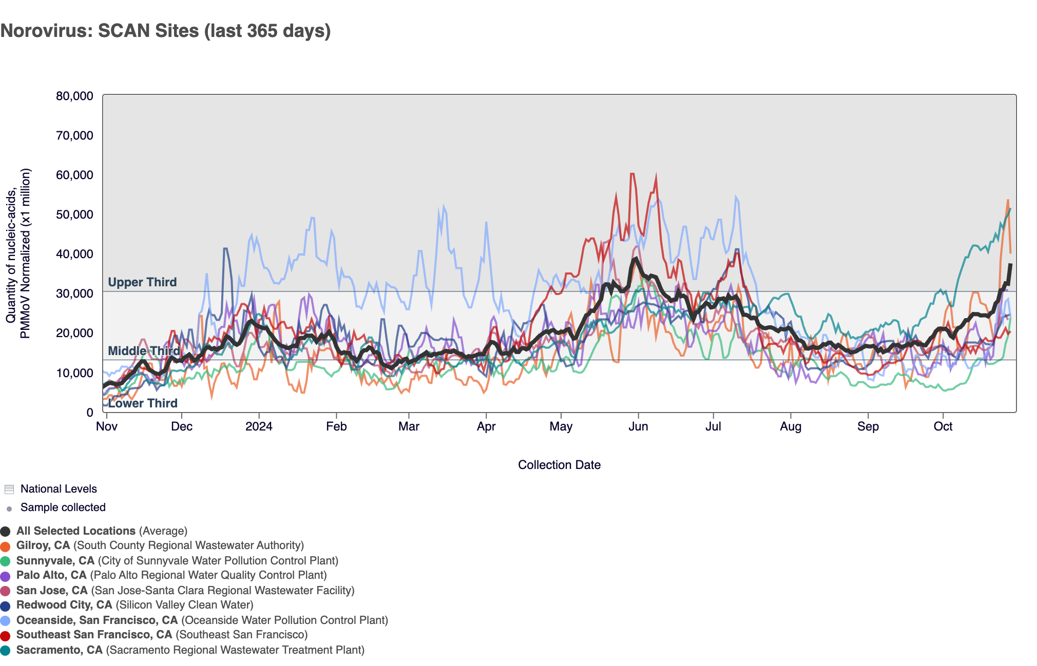- Gilroy, Oceanside SF, Sacramento, San Jose, and Sunnyvale are in the HIGH Wastewater Category for Norovirus