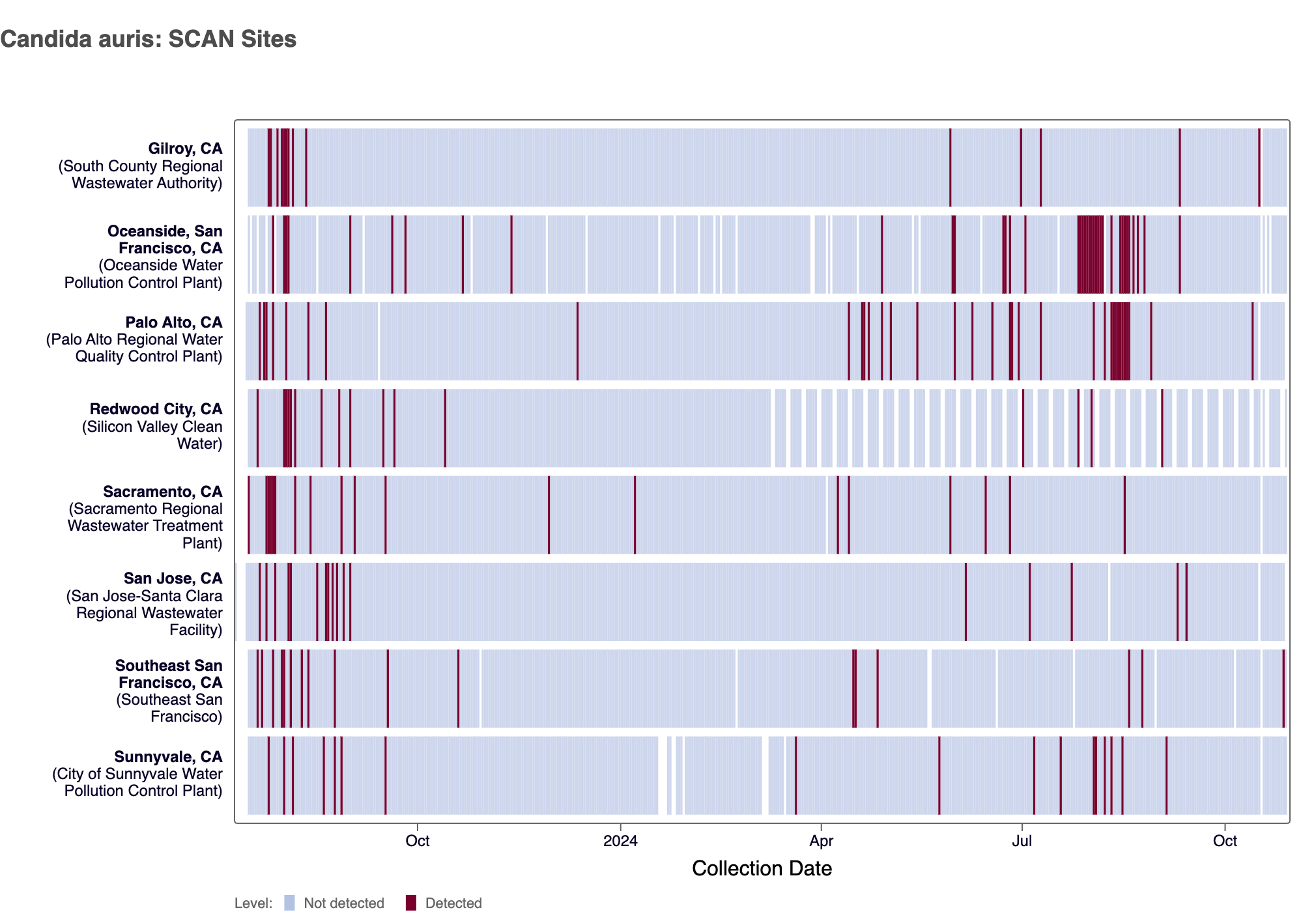Candida auris DNA was detected at 3 SCAN sites in the last 3 weeks (Gilroy, Palo Alto, and Southeast SF). Currently all SCAN sites are in the 'LOW' category for C. auris.