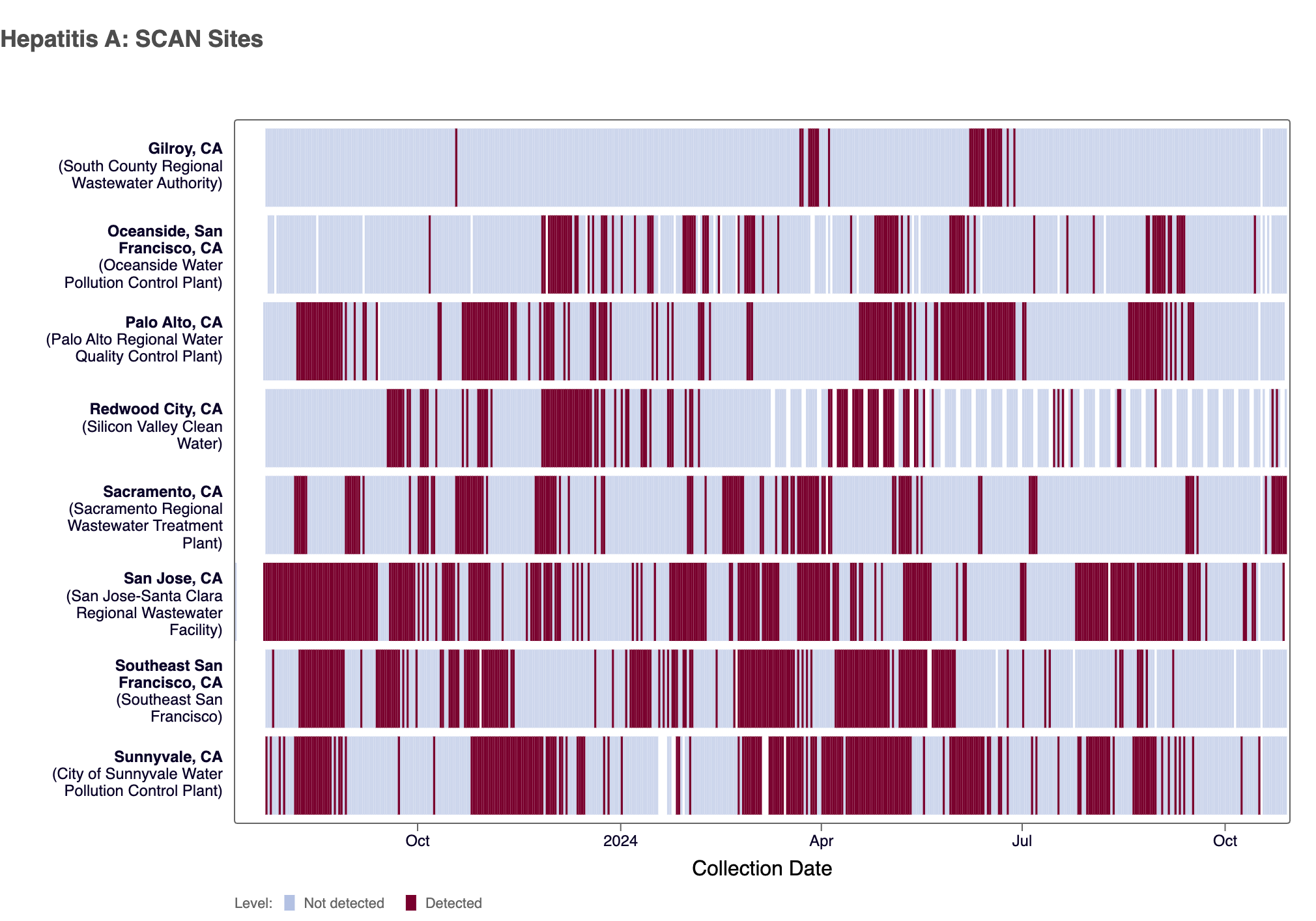 Hepatitis A RNA was detected at three of the SCAN sites in the last 3 weeks (Oceanside SF, Sacramento, and Sunnyvale).