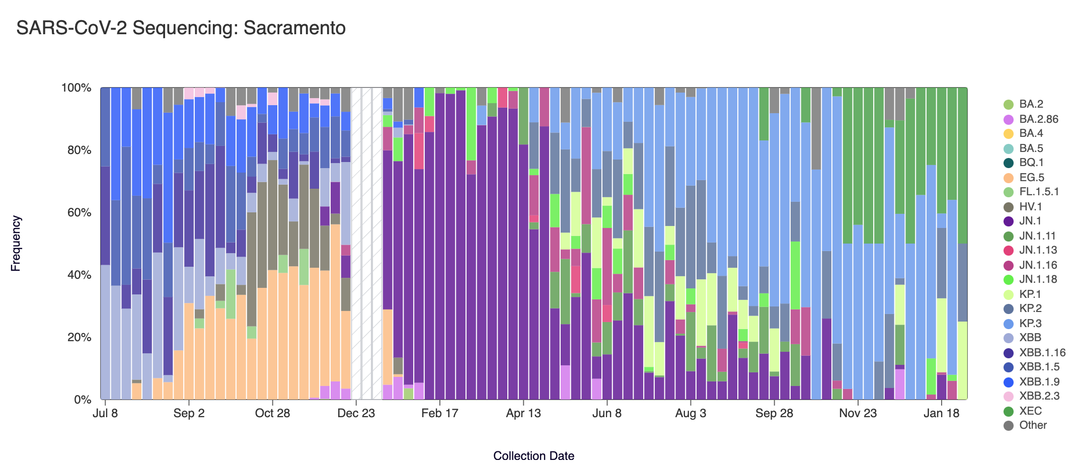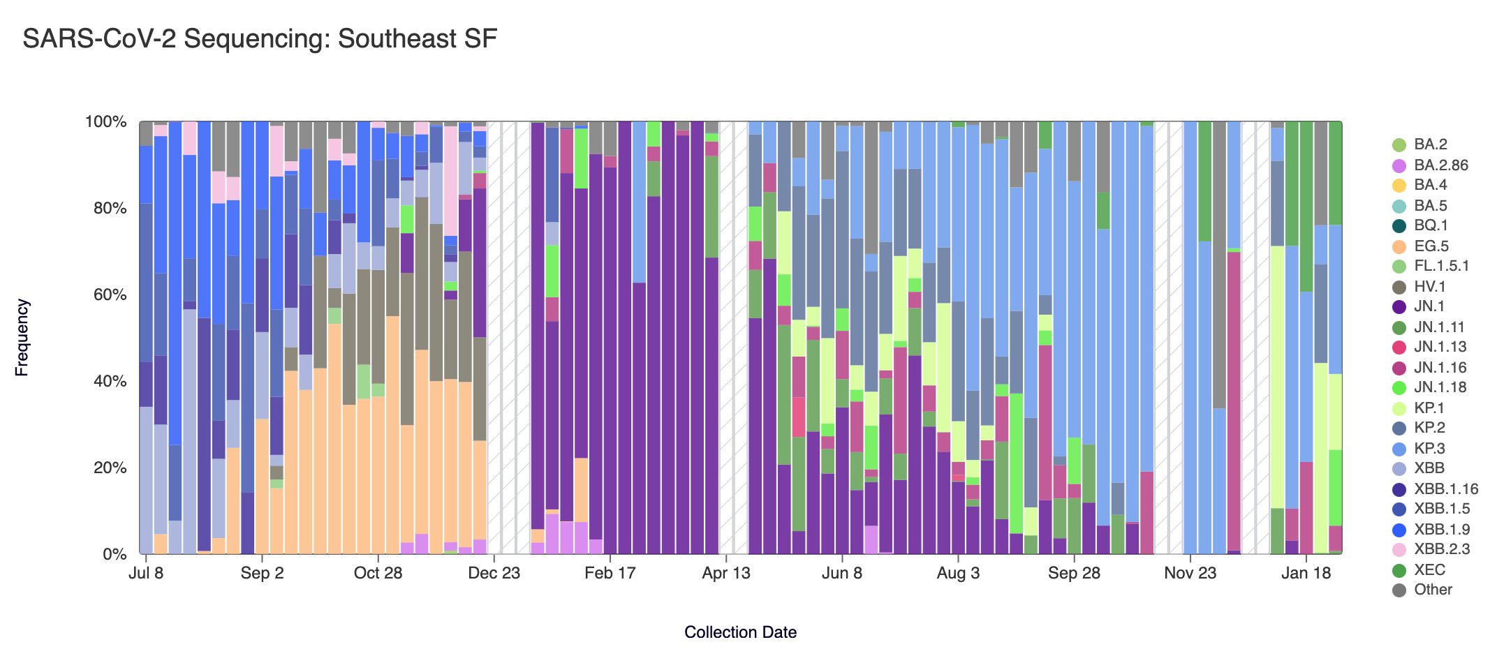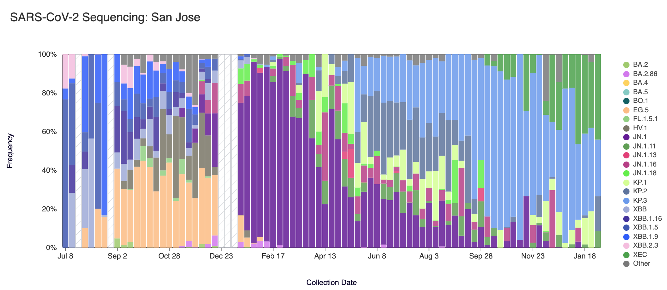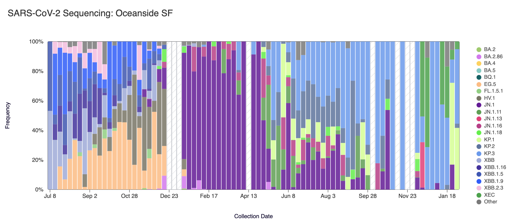 Below are plots from Oceanside SF, Sacramento, San Jose, and Southeast SF showing the relative proportions of different variants inferred from sequencing the entire genome of SARS-CoV-2. White and grey striped bars indicate no data is currently available for that week.