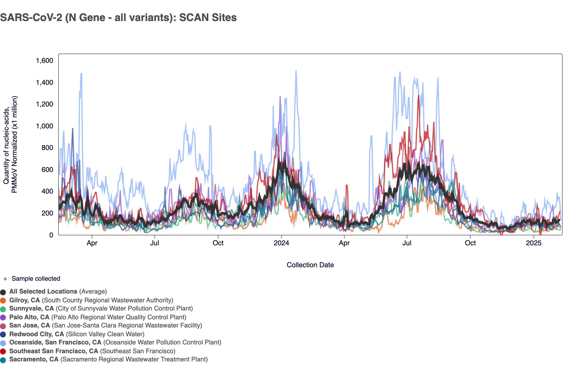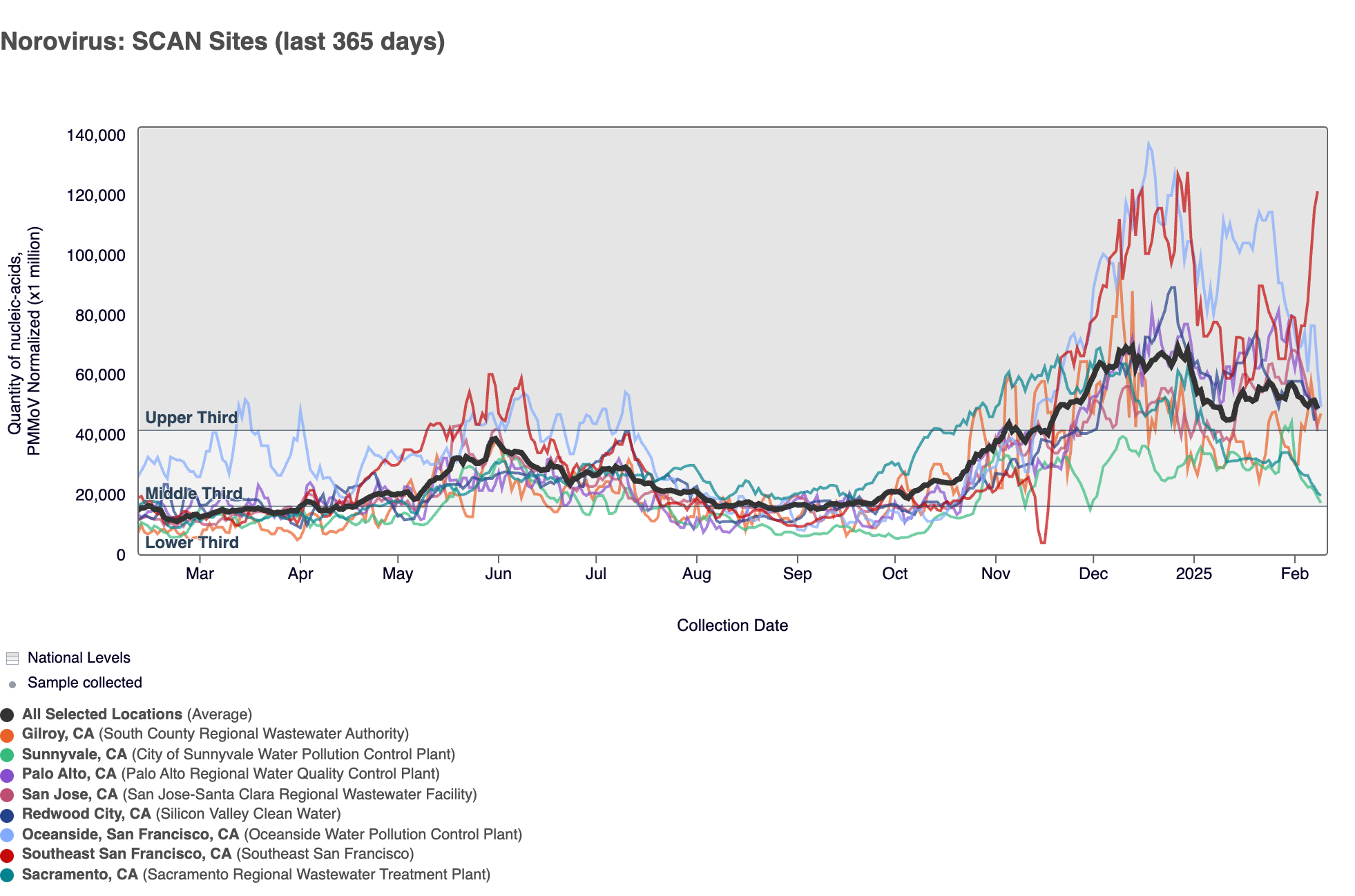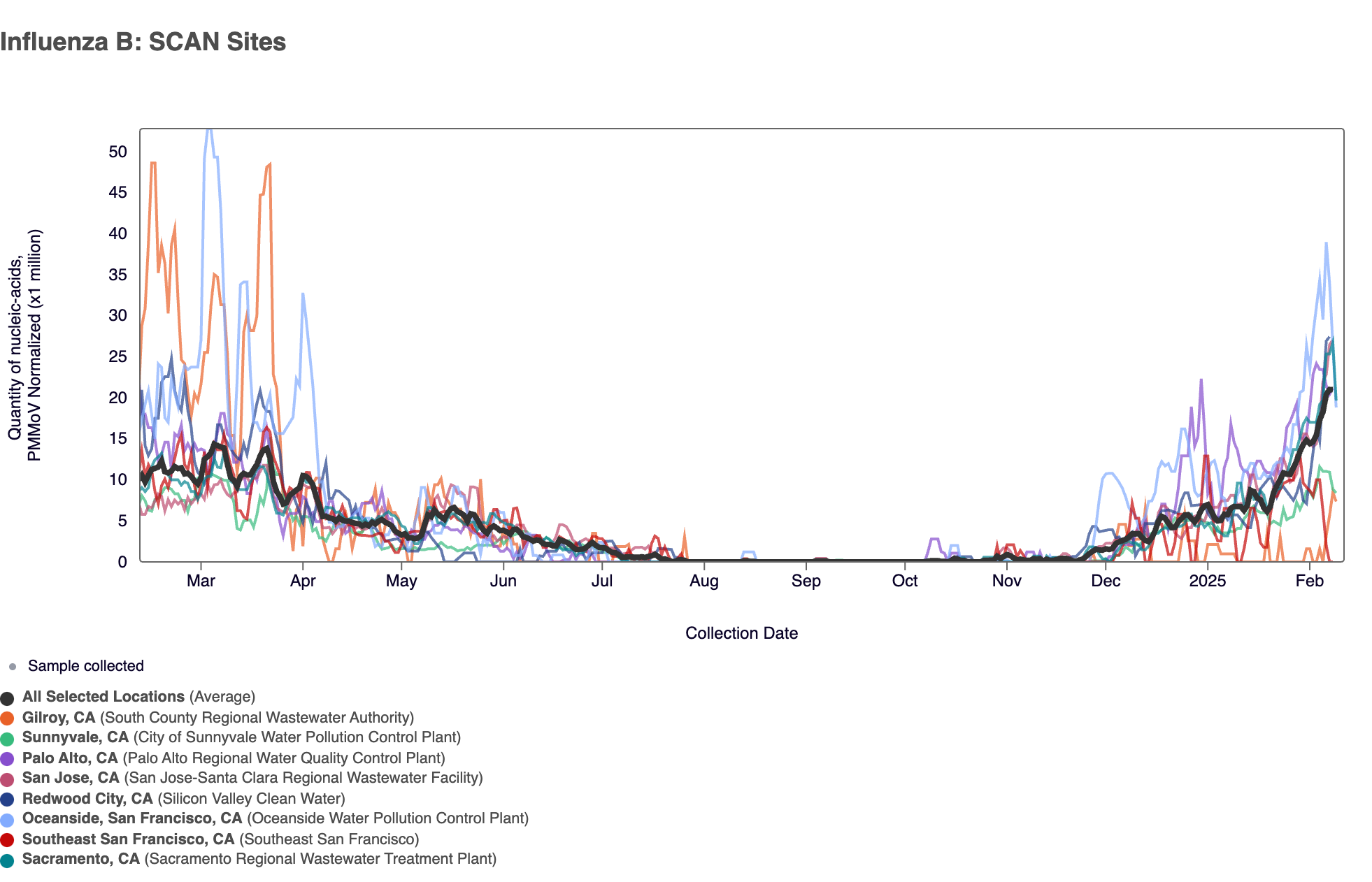 Below are all the data from all the SCAN plants for the last two years. You can access the graph here. The population weighted average across the SCAN plants is shown in black. The population weighted average has plateaued in recent weeks and concentrations are lower than where they were this time last year (Feb 2025).