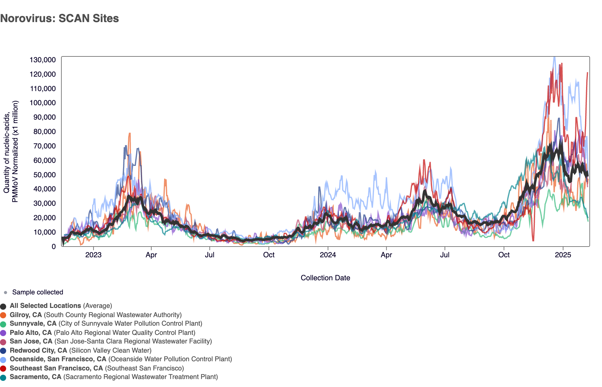 The plot below shows the Norovirus concentrations at the SCAN sites since we began monitoring in late 2022. The population weighted average line is shown in black. You can interact with the chart of all the plants at this link.