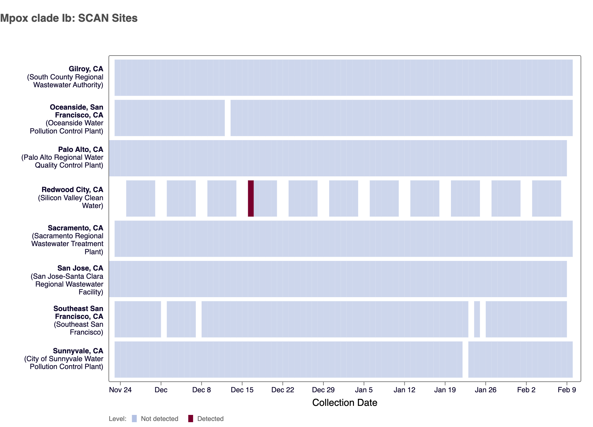 The heat map below shows all the SCAN sites as a row, and each date as a column since June 2022. The color blue means that Mpox clade II DNA was not detected in the sample, and the dark red color means it was detected. White indicates no sample was collected. The chart shows all the data we have collected. You can access the chart here.