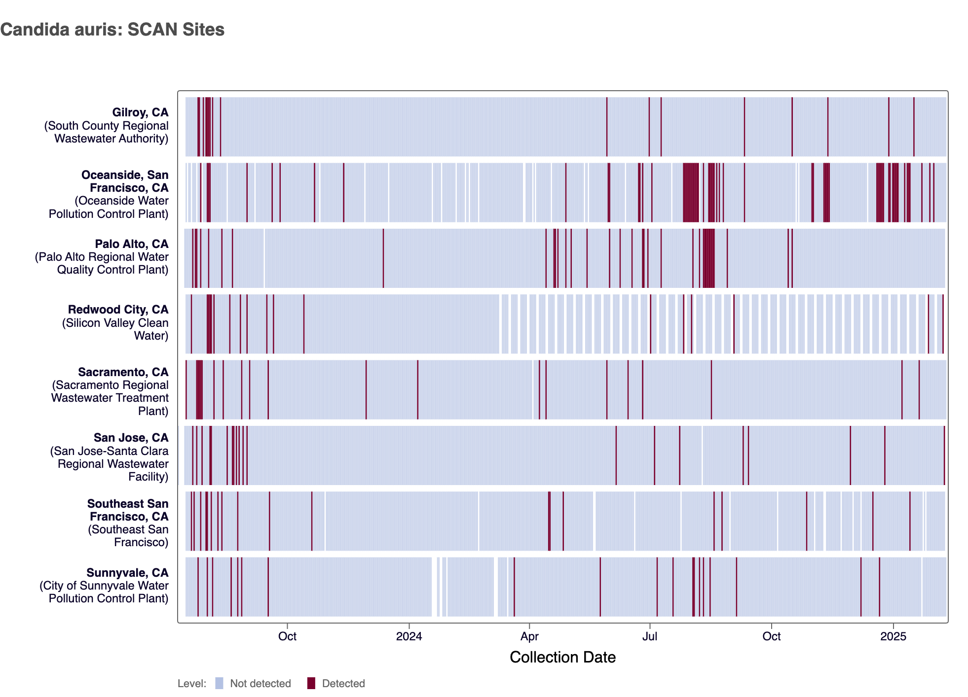 Candida auris DNA was detected at 3 SCAN sites in the last 3 weeks (Gilroy, Oceanside SF, San Jose, and SVCW). Currently all 8 SCAN sites are in the 'LOW' category for C. auris.