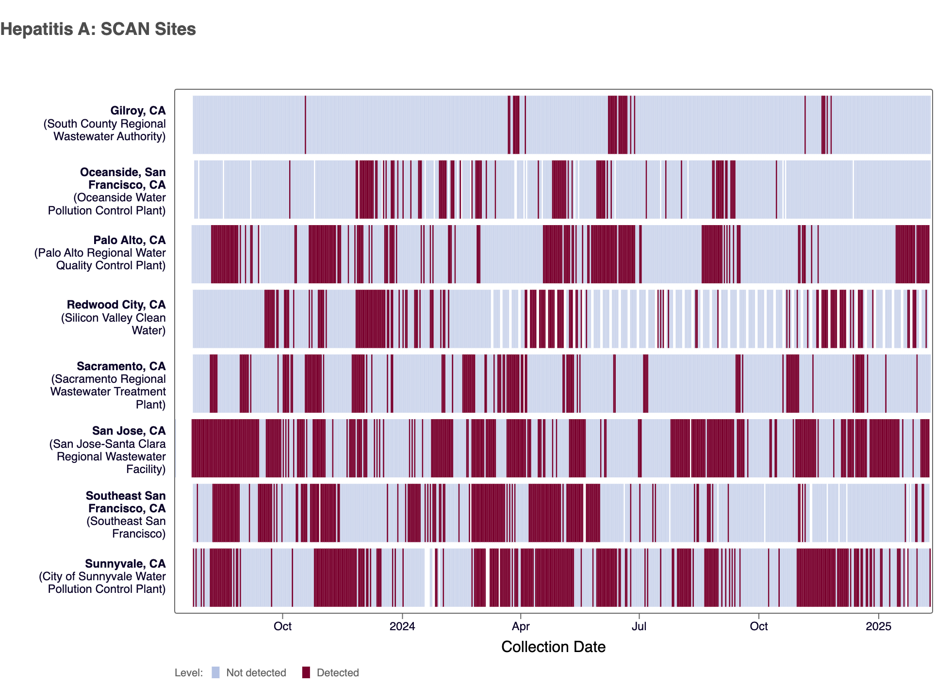 Hepatitis A RNA was detected at 6 of the SCAN sites (Palo Alto, Sacramento, San Jose, Southeast SF, SVCW, and Sunnyvale) in the last 3 weeks.