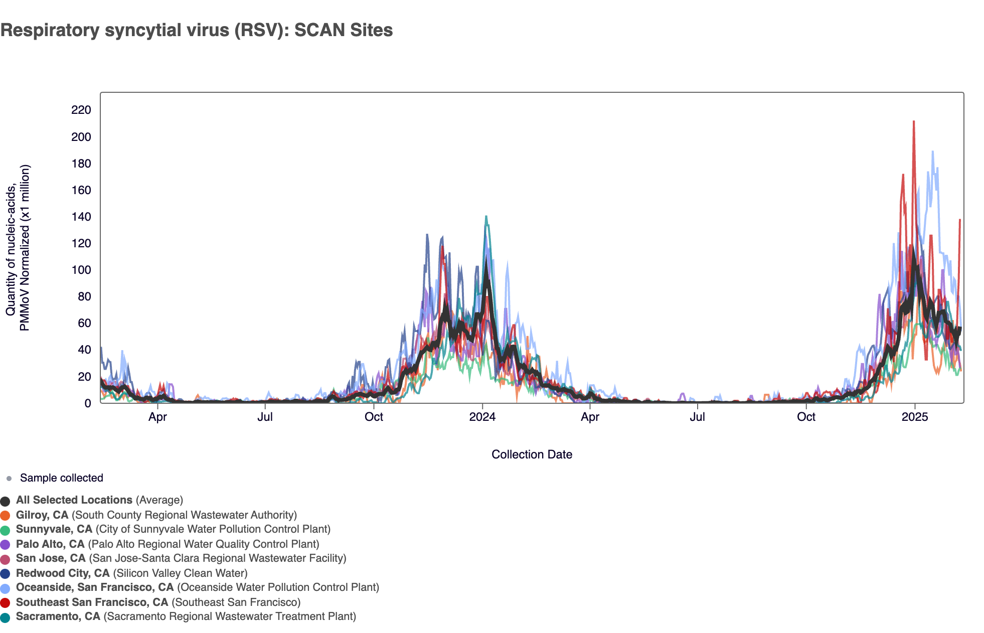 In the chart below (representing data from the past 2 years), the population weighted average line across all the SCAN sites is shown in black, and you can see the current concentrations relative to the peak RSV levels from 2024. The link to the chart below is here if you would like to interact with it.