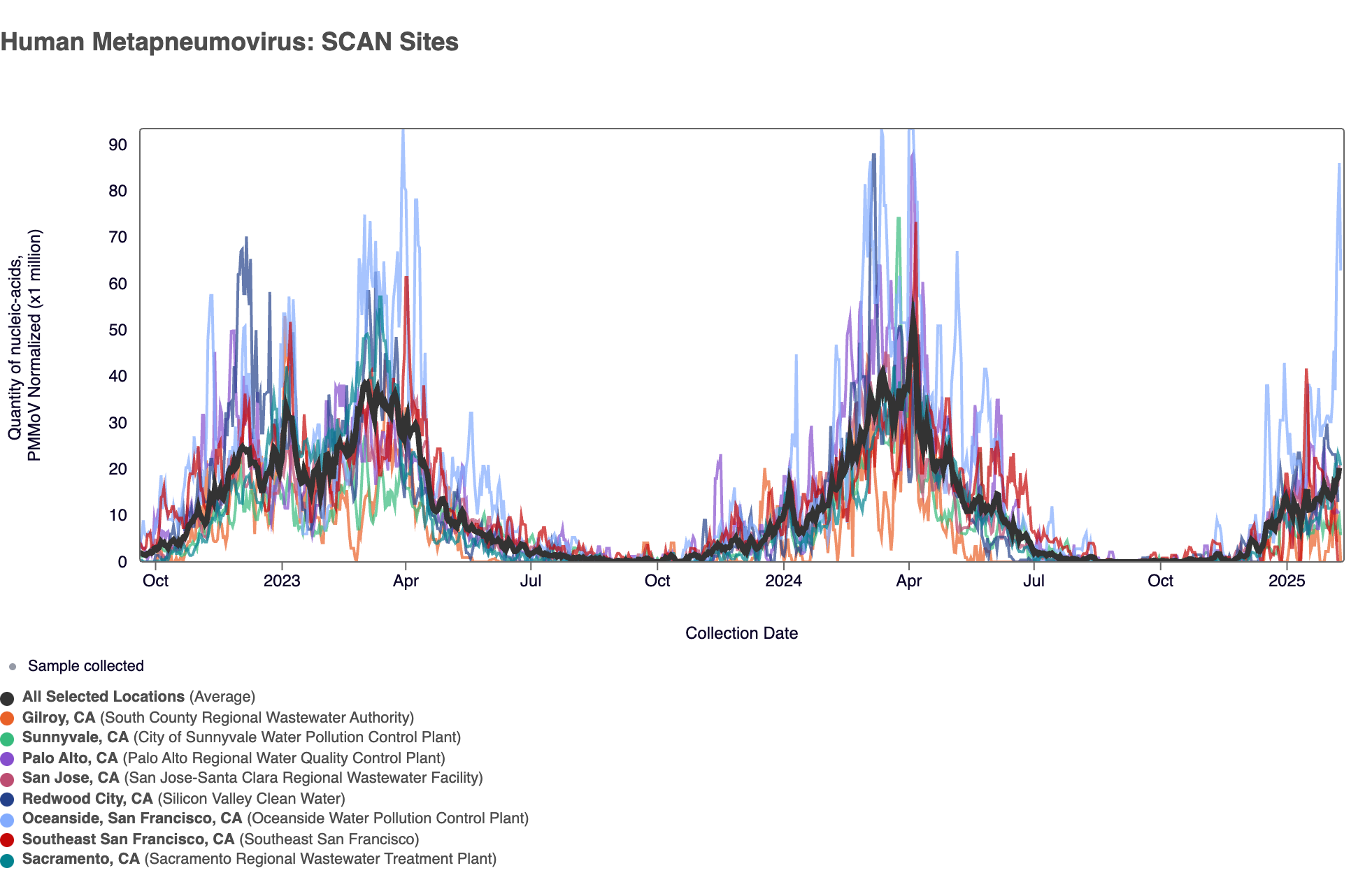 - Oceanside SF, Palo Alto, Sacramento, San Jose, and SVCW are in seasonal onset and in the HIGH Wastewater Category for HMPV
