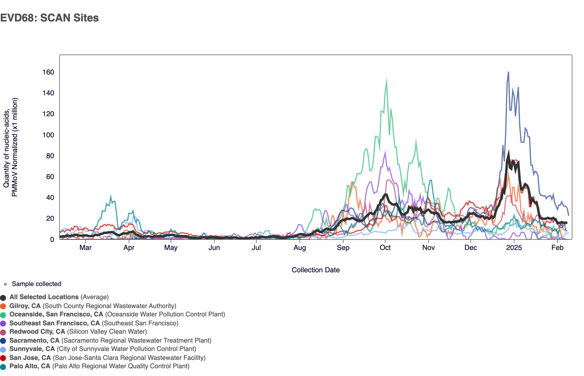 In the chart below, the population weighted average line across all the SCAN plants is shown in black over the last 12 months. Evident in the chart were increasing EV-D68 concentrations in early August 2024, concentrations plateauing in early November 2024 to late December 2024. Concentrations began to rise again at the start of 2025 and are starting to decrease again.
